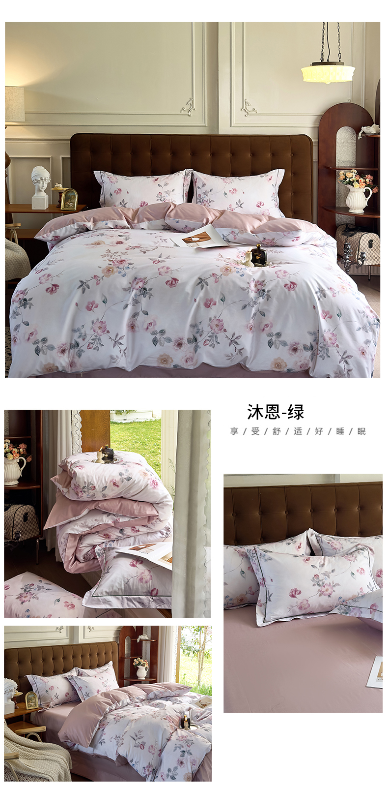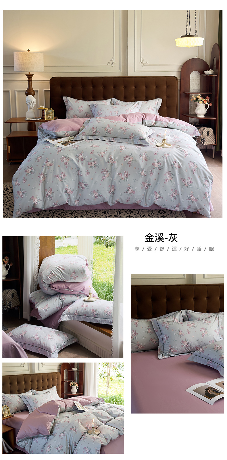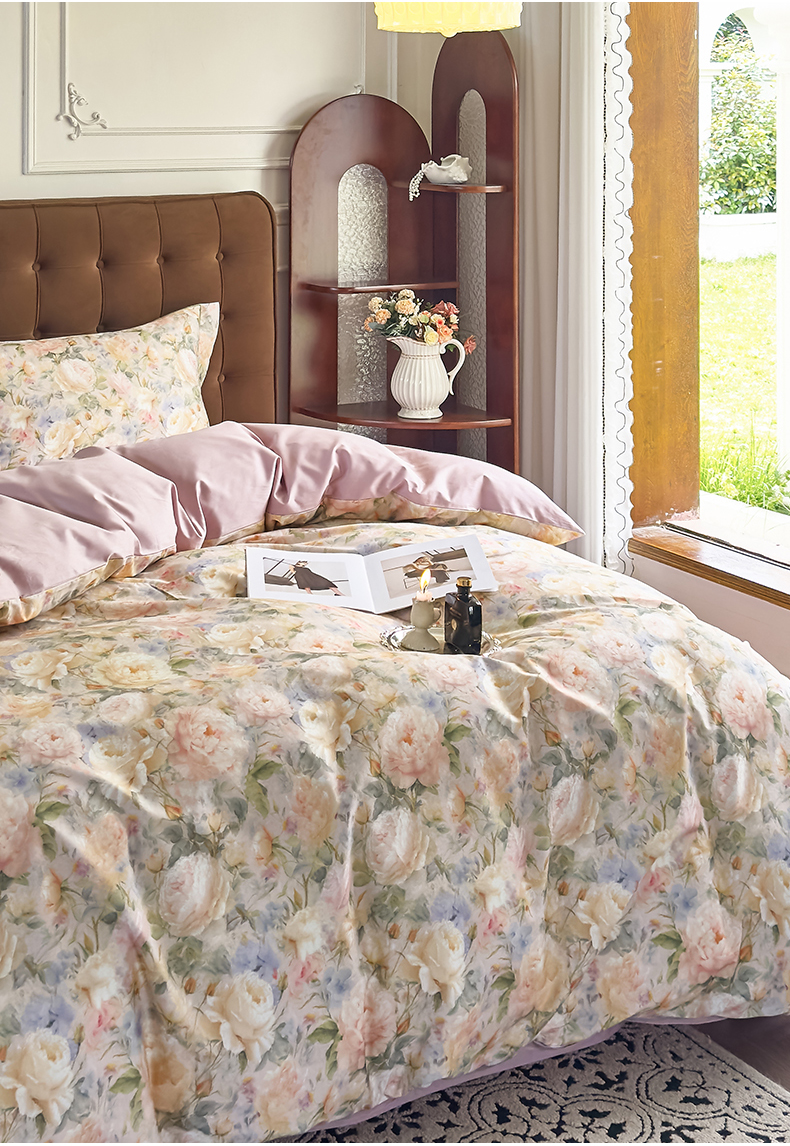 (总)由丽家纺 2025新款亲肤舒适全棉纯棉臻棉数码印花四件套系列,繁花似锦,感棉-粉,金溪-灰,金溪-咖,茂林-兰,明羽-黄,沐恩-绿,野玫瑰-紫,感棉-绿,玫瑰颂-粉