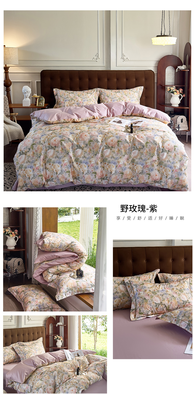 商品名称:由丽家纺 2025新款亲肤舒适全棉纯棉臻棉数码印花四件套系列 野玫瑰-紫