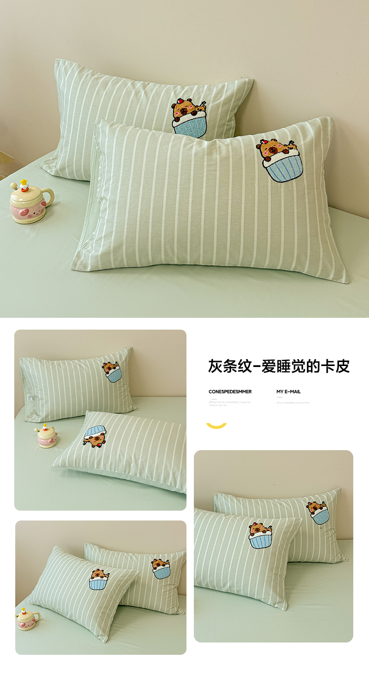 • 91家纺网 家纺一手货源 找家纺 呗旺鹿 2025新款全棉纯棉条纹毛巾绣卡通单枕套 枕套单件 灰条纹-爱睡觉的卡皮