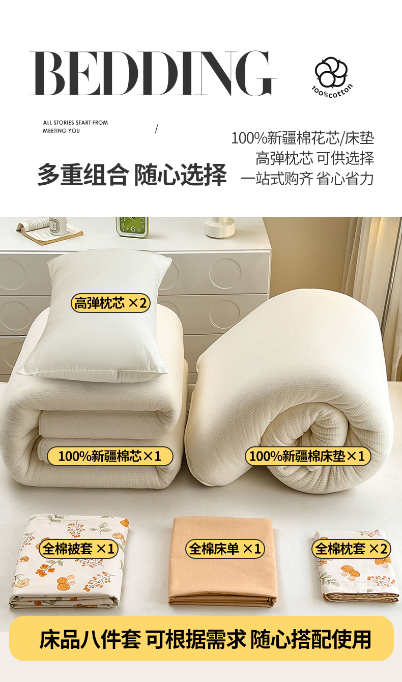 西域种棉人·千百笠 2025新款全棉纯棉大学生宿舍100%新疆棉花被子被褥一整套枕头床垫三件套六件套 蘑菇花园