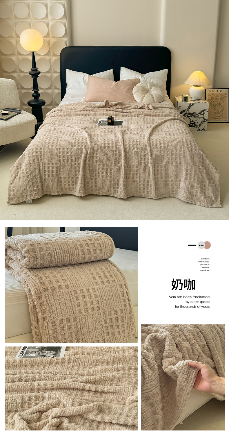 商品名称:穆琪2025新款高克重华夫格舒棉绒办公家用多功能毯子几何方块塔芙绒毛毯 奶咖