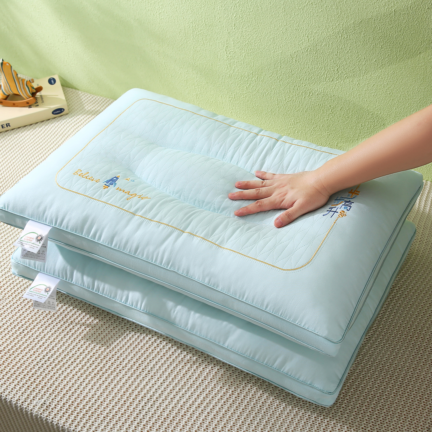 (总)橘夏家纺 2025新款英文刺绣按摩枕枕头枕芯,英文刺绣按摩枕-绿色,英文刺绣按摩枕-橙色