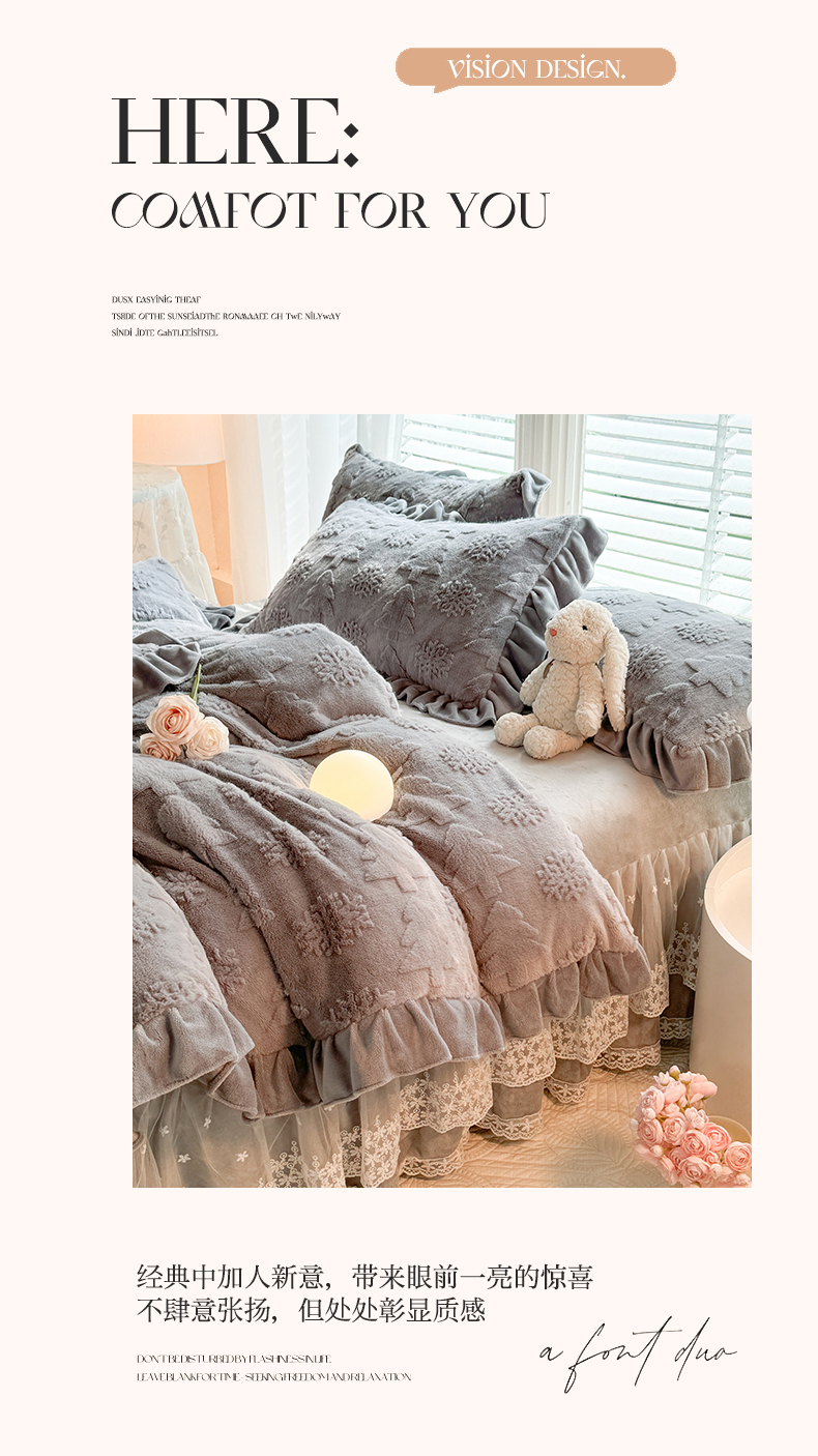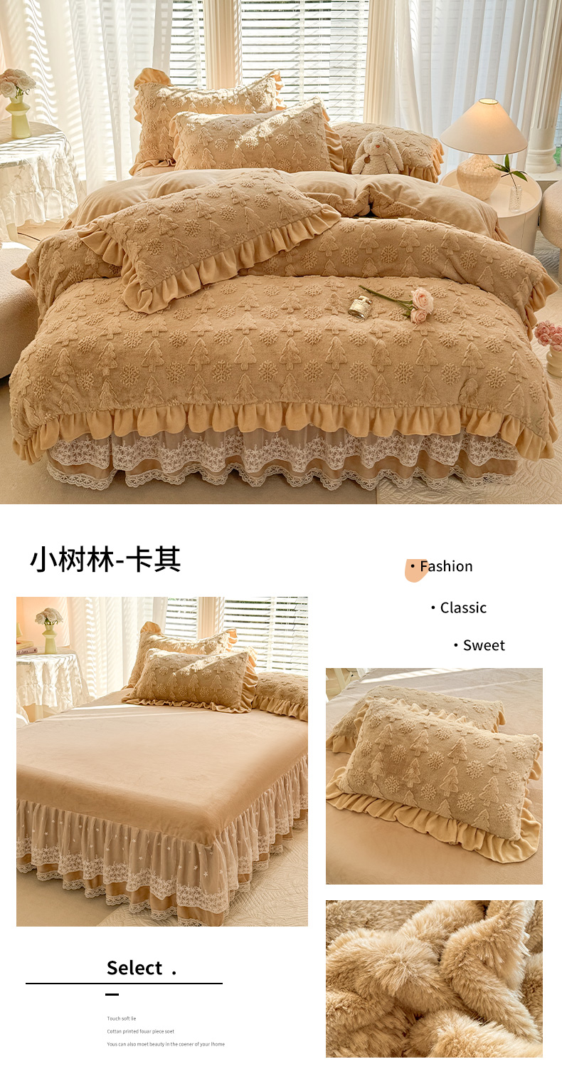商品名称:唐人居 2025新款雕花花边兔毛绒床裙四件套 小树林-奶白
