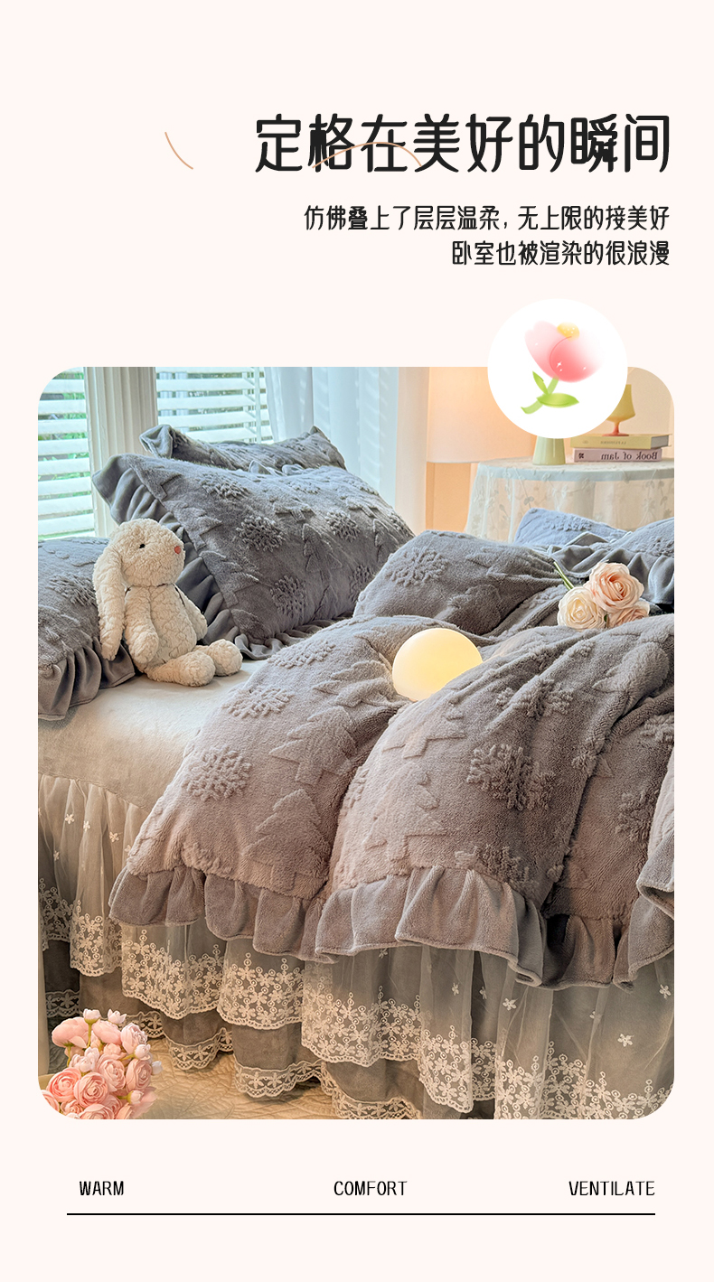 唐人居 2025新款雕花花边兔毛绒床裙四件套 小树林-奶白