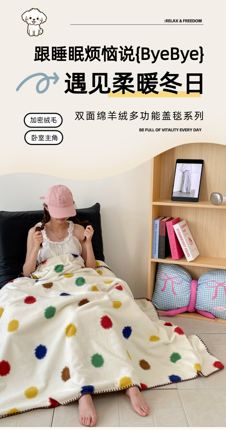 (总)晚爱家纺(原晚安家居) 2025新款跨境暖羊绒双面绵羊绒沙发毯多功能盖毯,彩波点,糖块,节日派对,咖波点,蓝郁,梦幻花园,南山蓝,七彩条,虚幻灰,虚幻米,组合图仅供展示不可下单