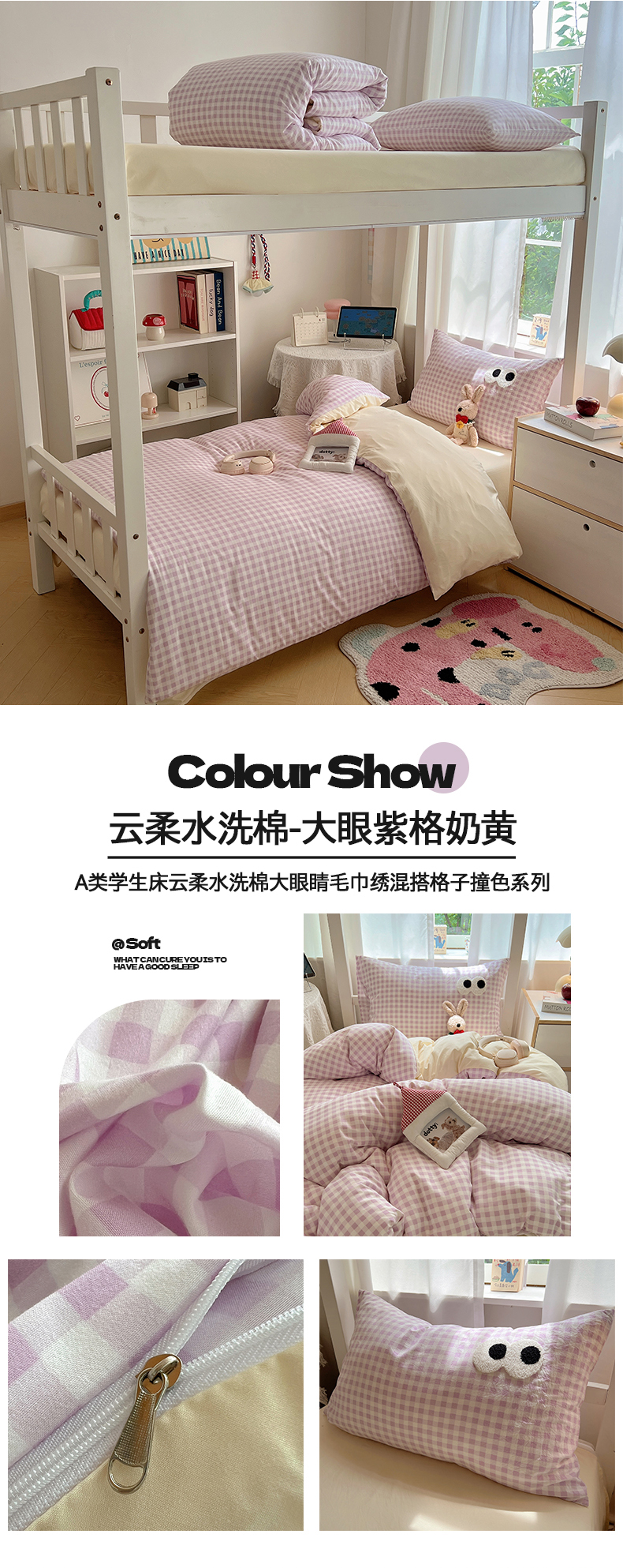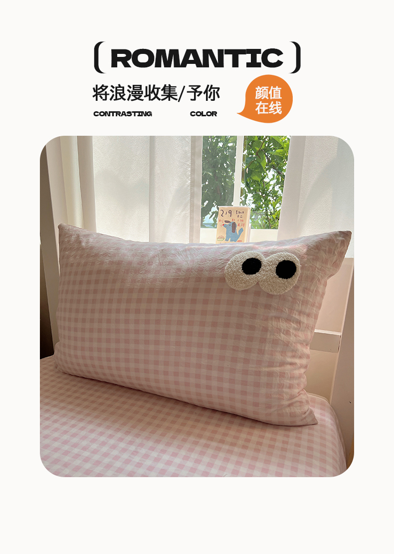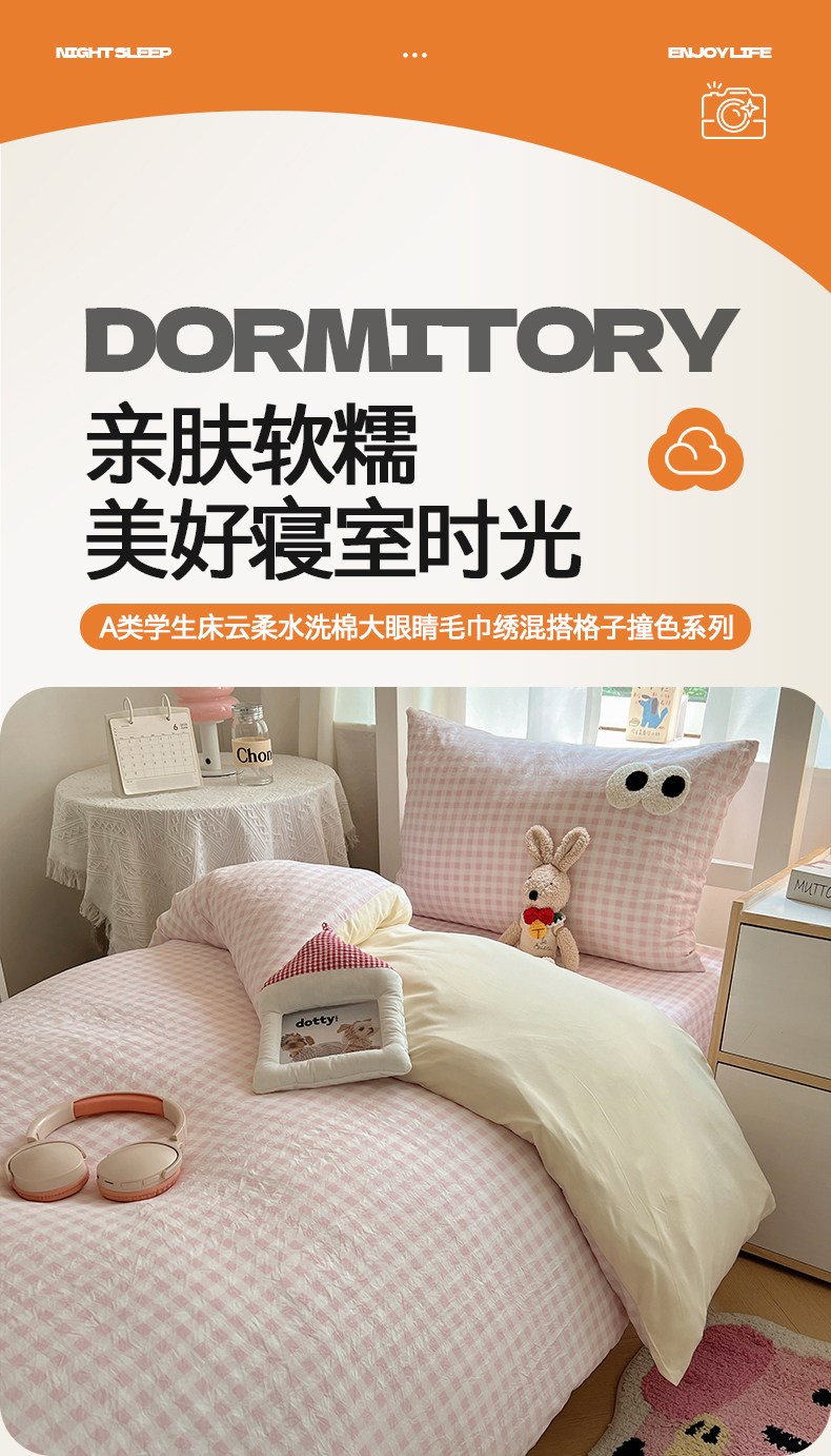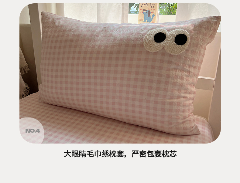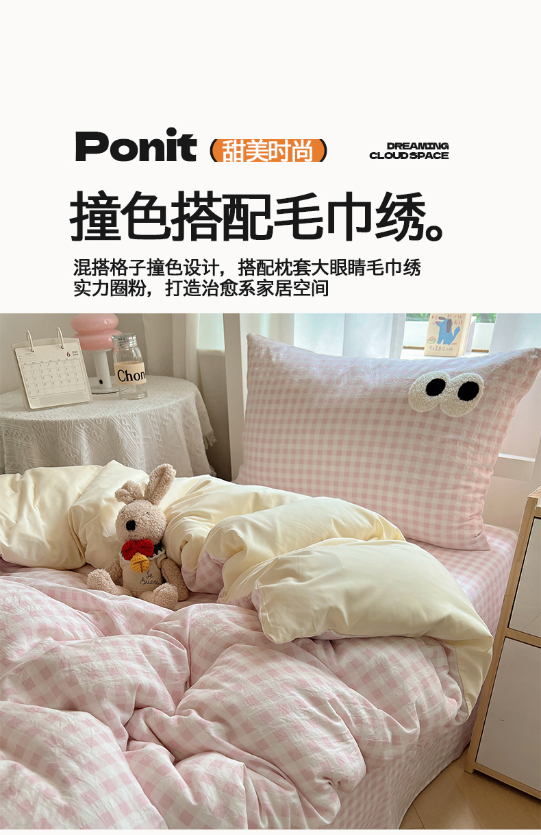 当前位置: 91家纺网 > 商品网购 > 床品套件 > 三件套 > 桃心家居 2025新款A类学生床三件套亲肤舒适软糯云柔水洗棉大眼睛毛巾绣混搭格子撞色系列四件套 云柔水洗棉-大眼粉小格奶黄