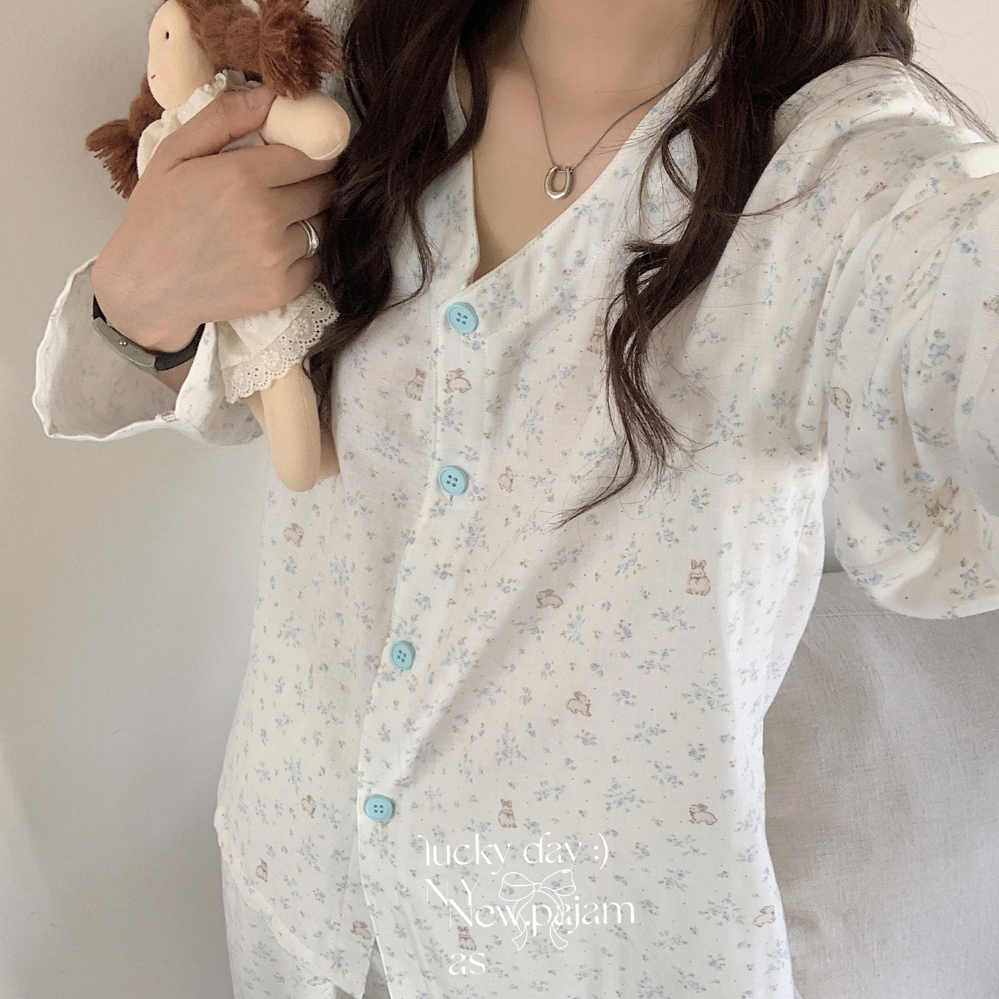 商品名称:纽约生活 2025新款有氧纱V领套装(会员-5) 碎花蓝兔兔