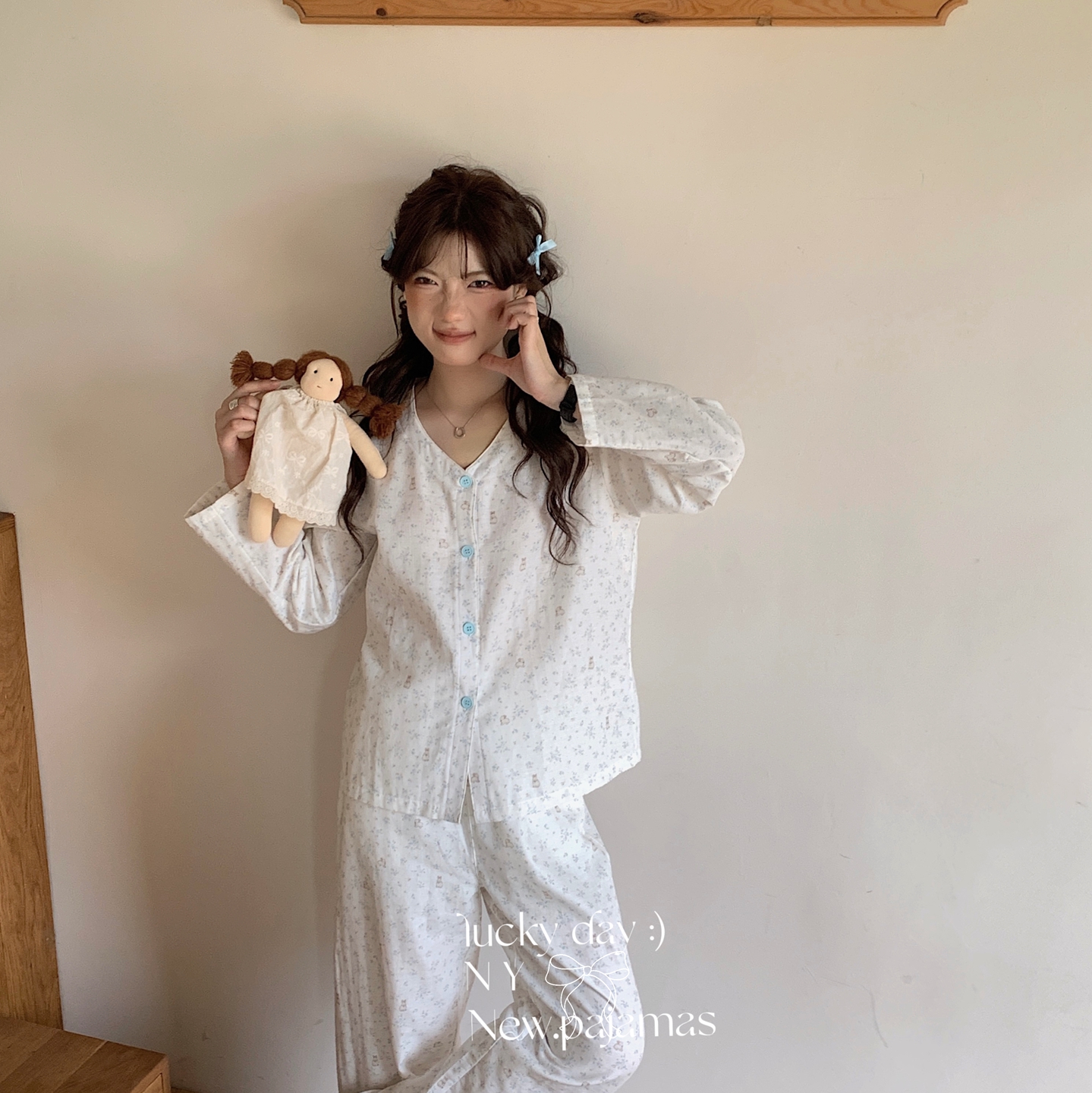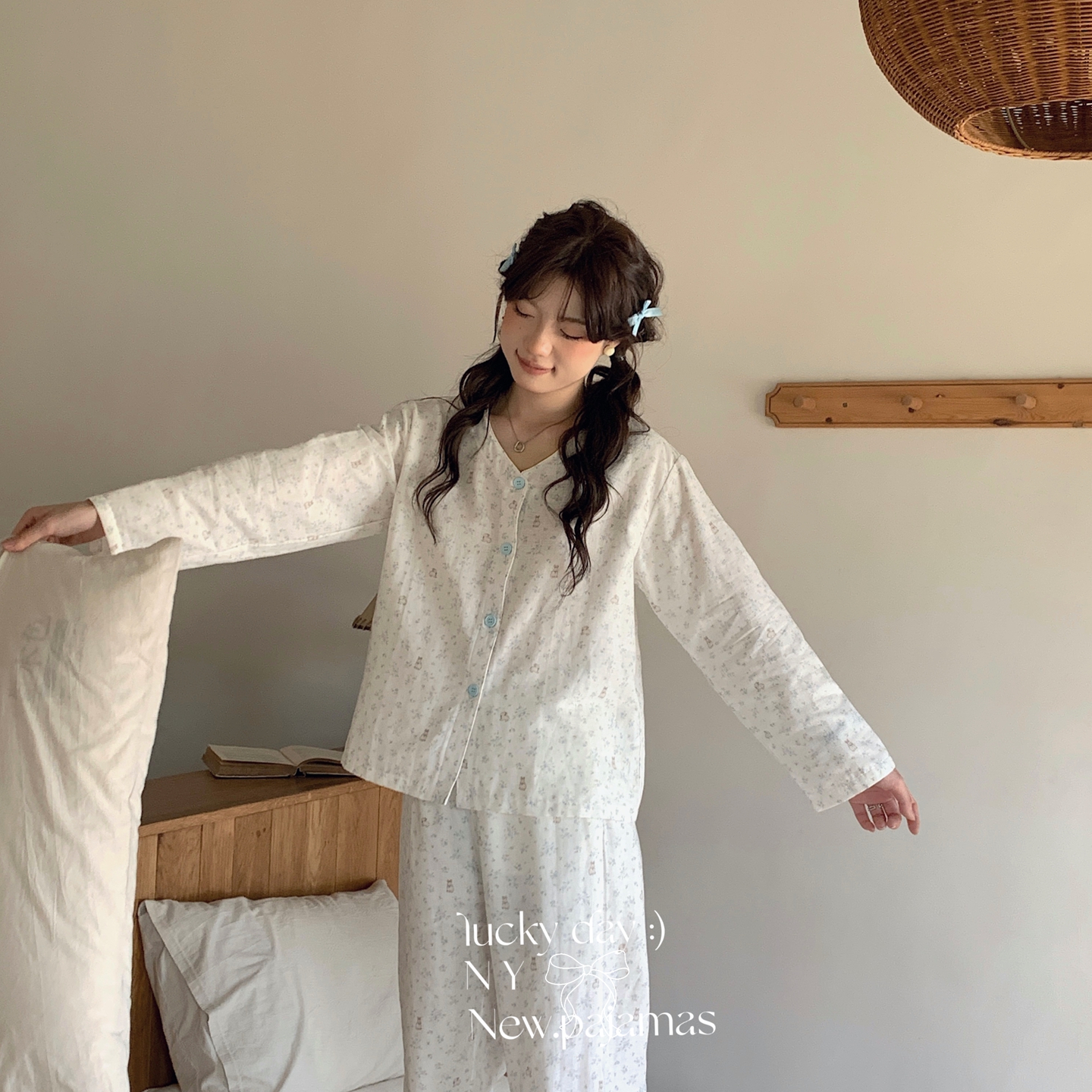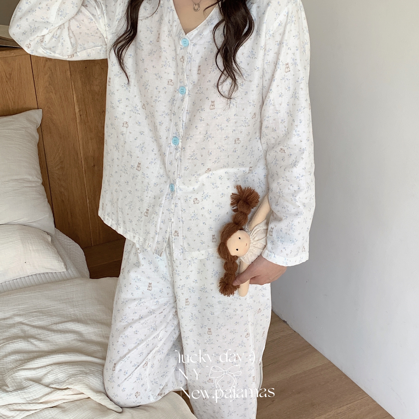(总)纽约生活 2025新款绉布圆领开扣长袖长裤(会员-5),波比熊,黑碎花猫咪,蝴蝶结粉熊,花花狗,蓝碎花,塞纳花房