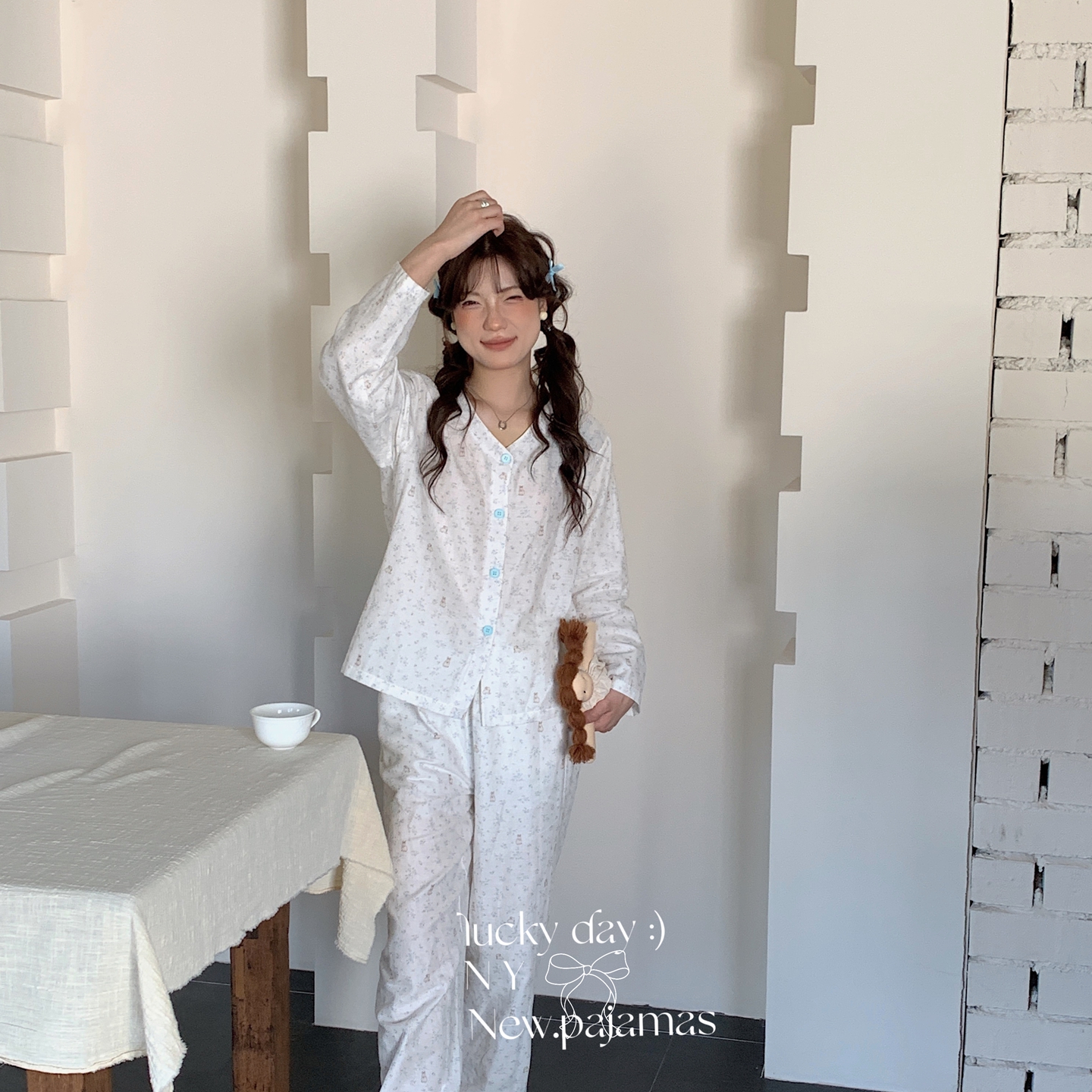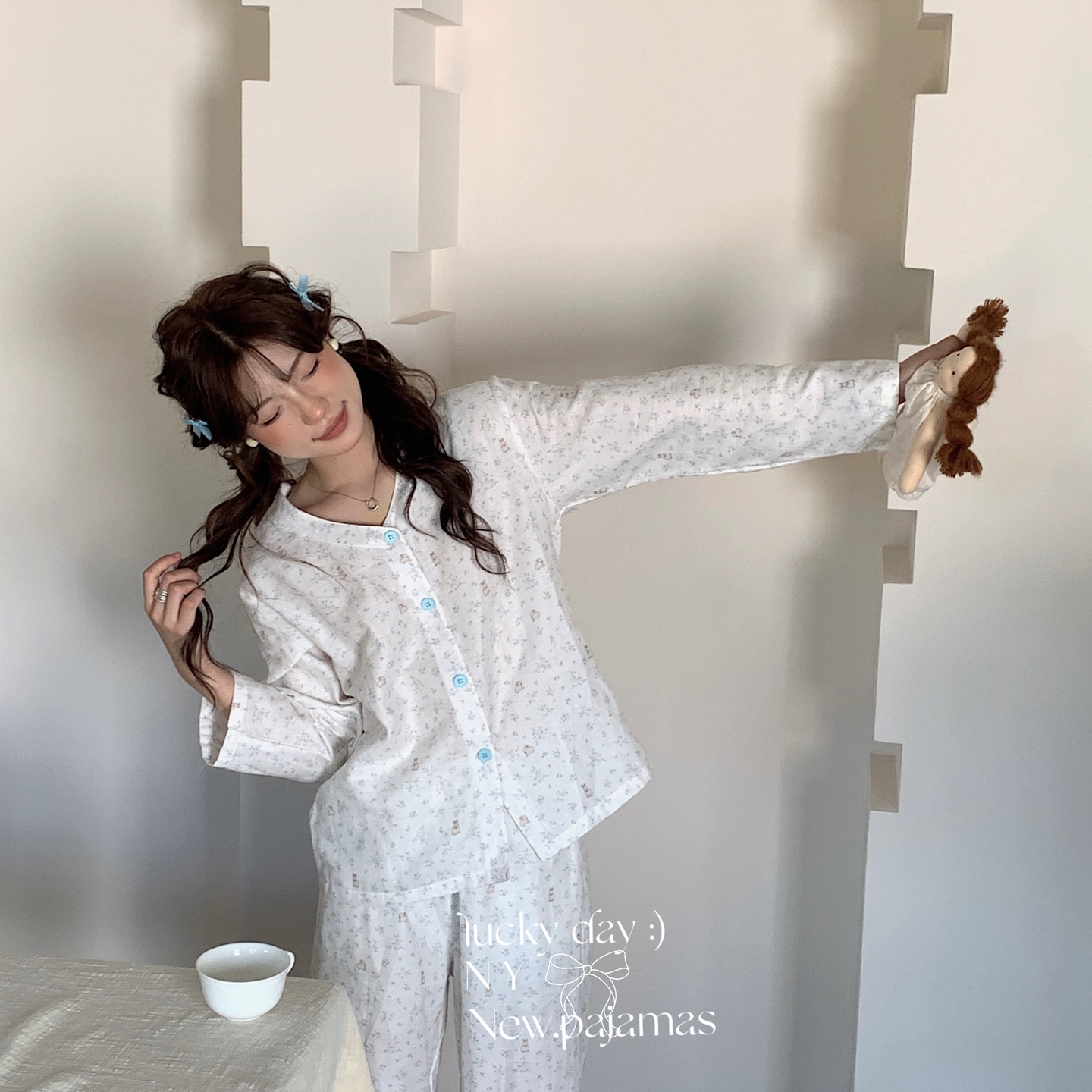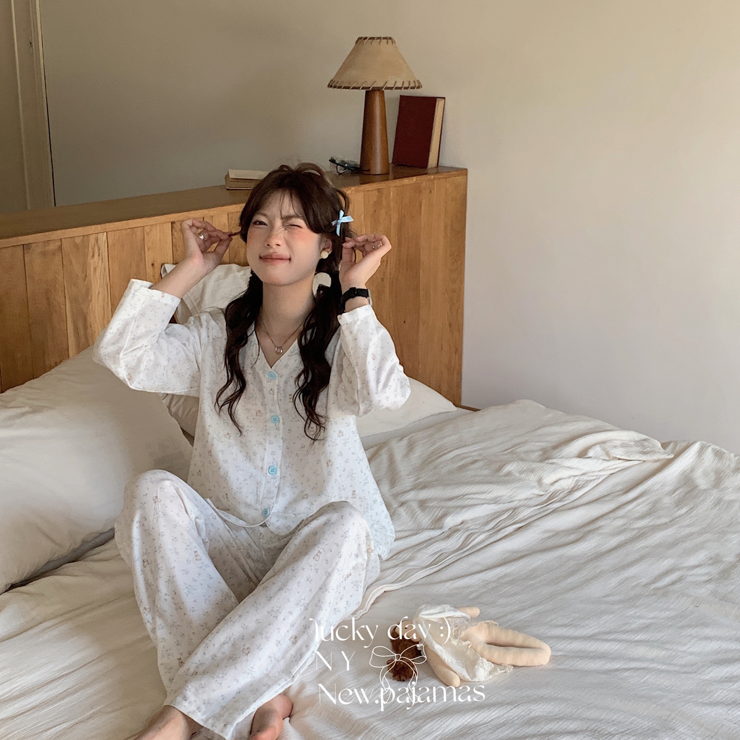 (总)纽约生活 2025新款绉布圆领开扣长袖长裤(会员-5),波比熊,黑碎花猫咪,蝴蝶结粉熊,花花狗,蓝碎花,塞纳花房