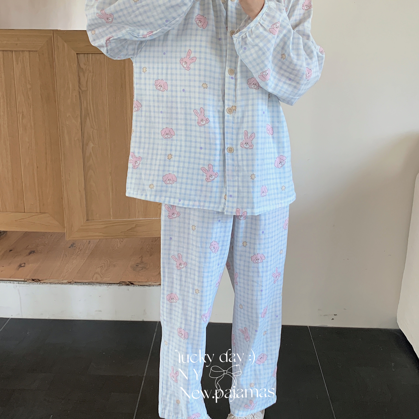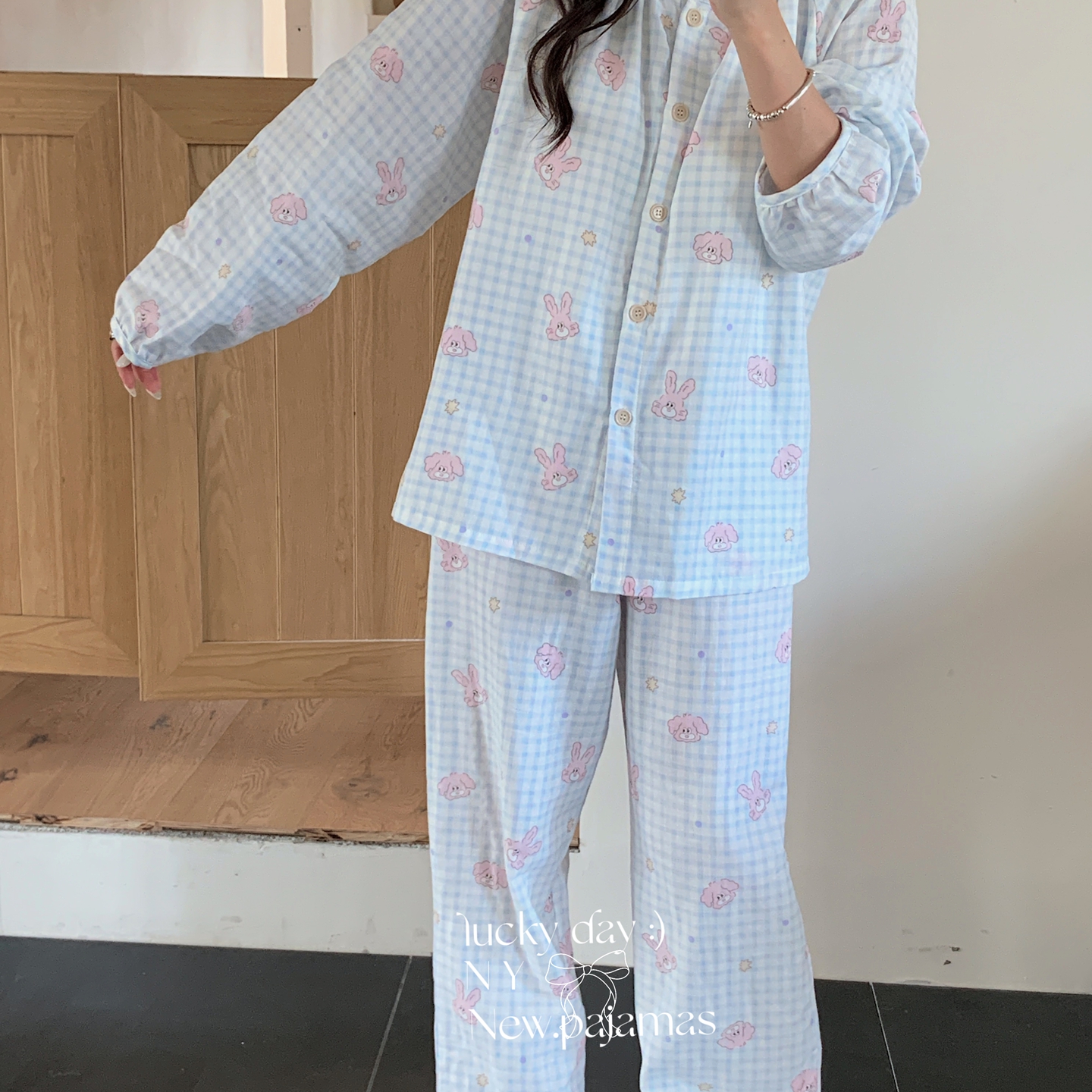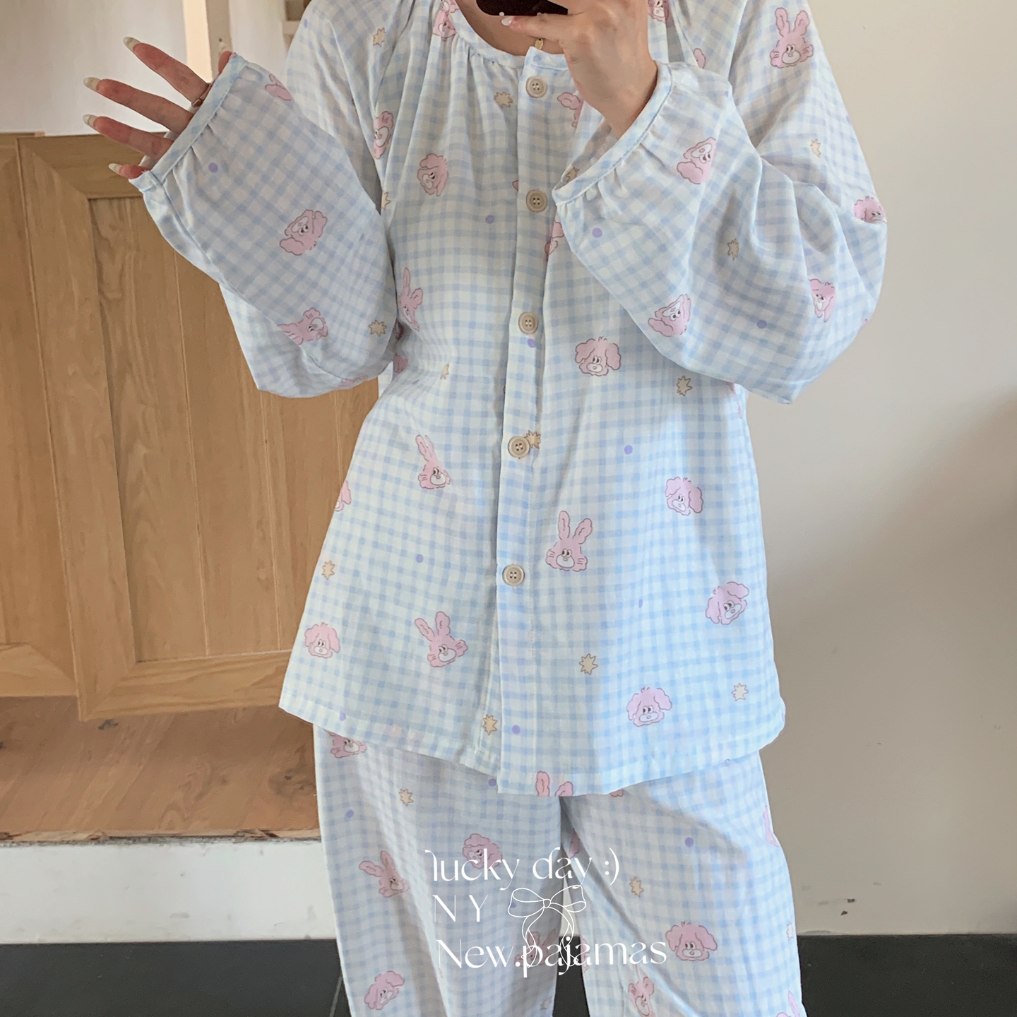 商品名称:纽约生活 2025新款有氧纱胸垫圆领开扣长袖长裤(会员-5) 蓝格奶茶兔