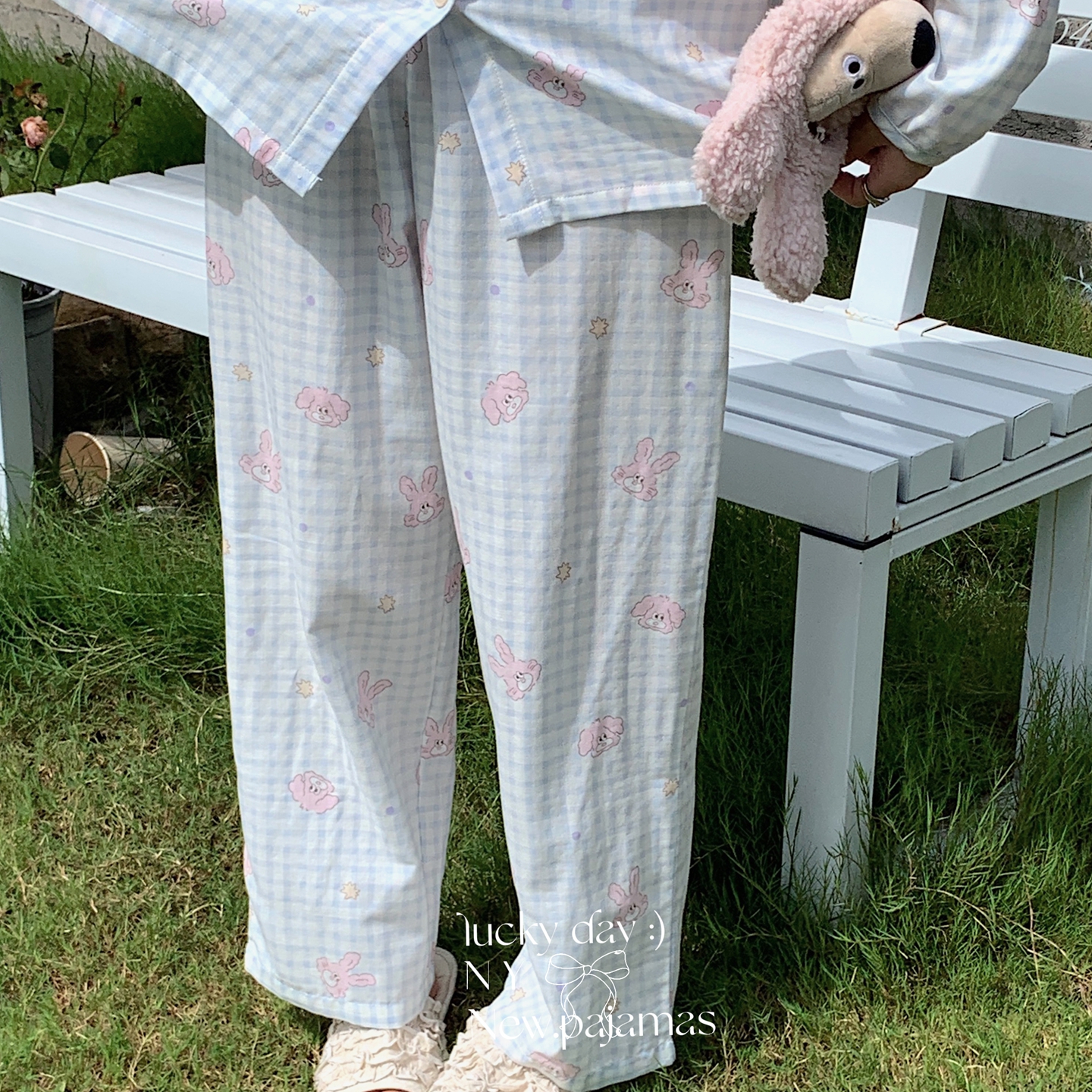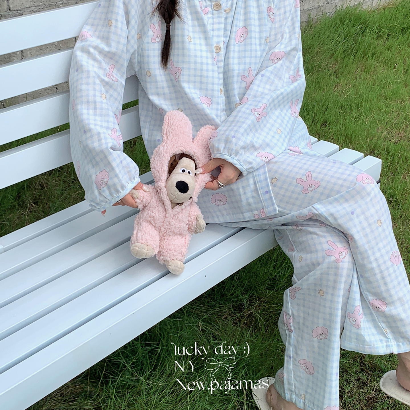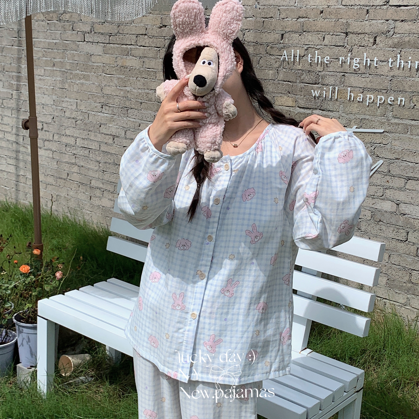 商品名称:纽约生活 2025新款有氧纱胸垫圆领开扣长袖长裤(会员-5) 蓝格奶茶兔