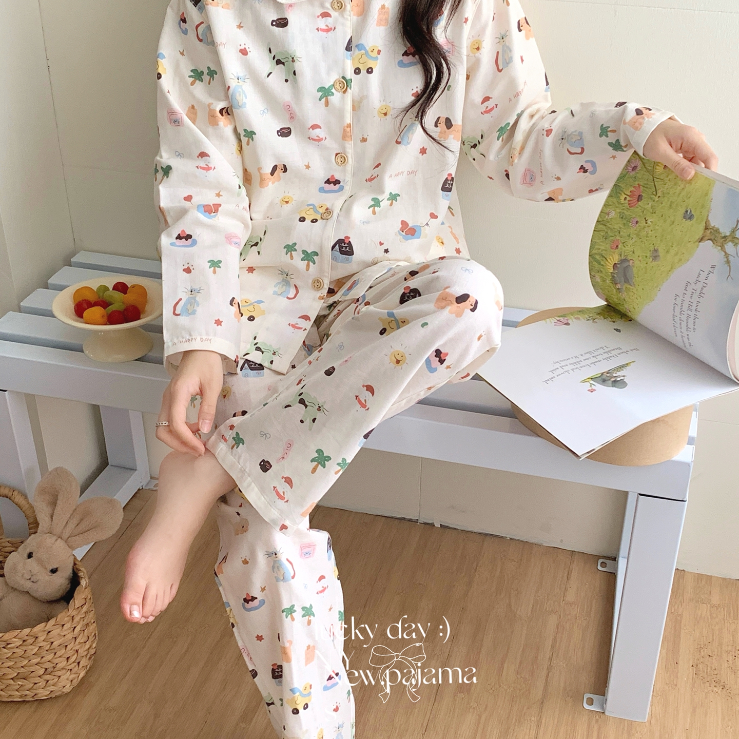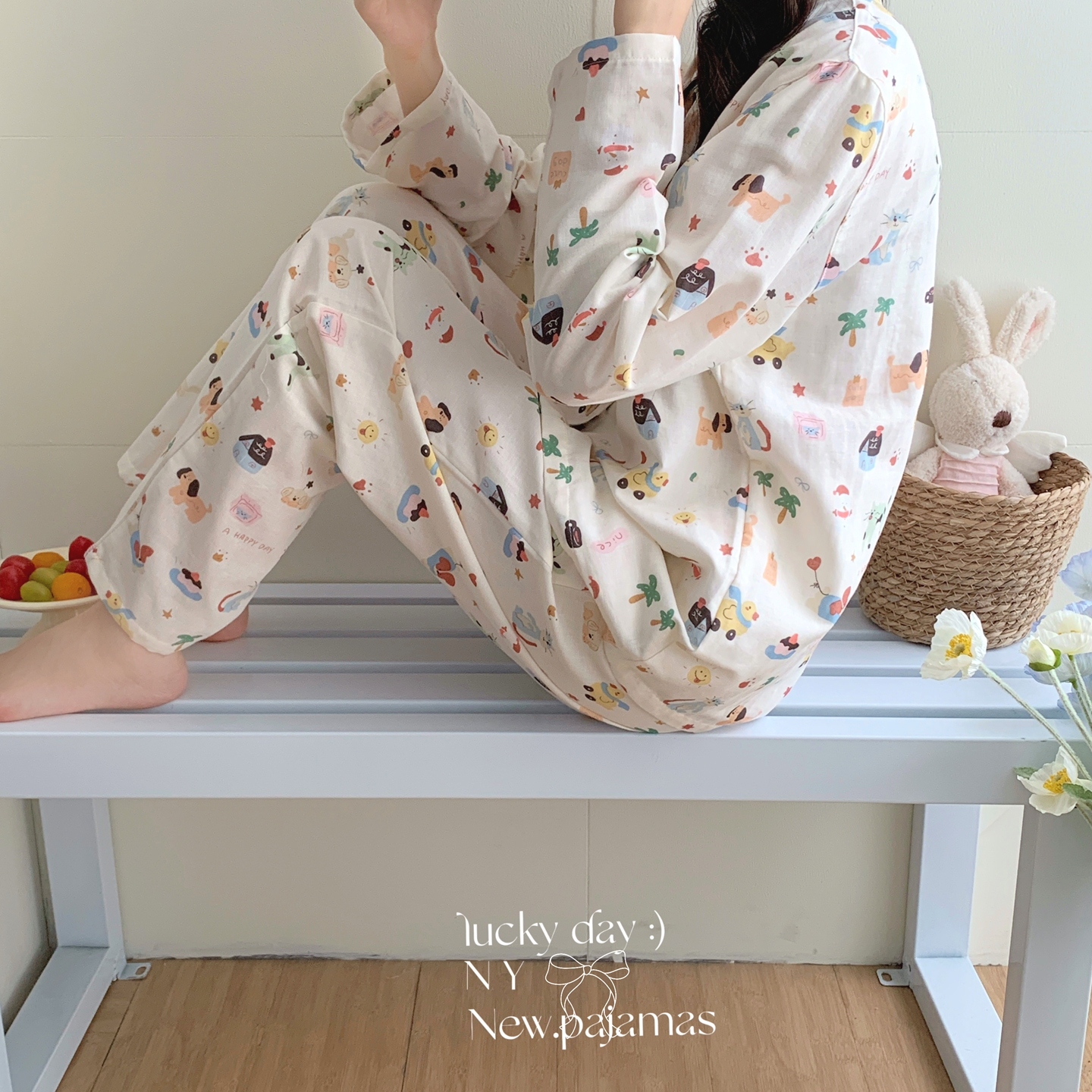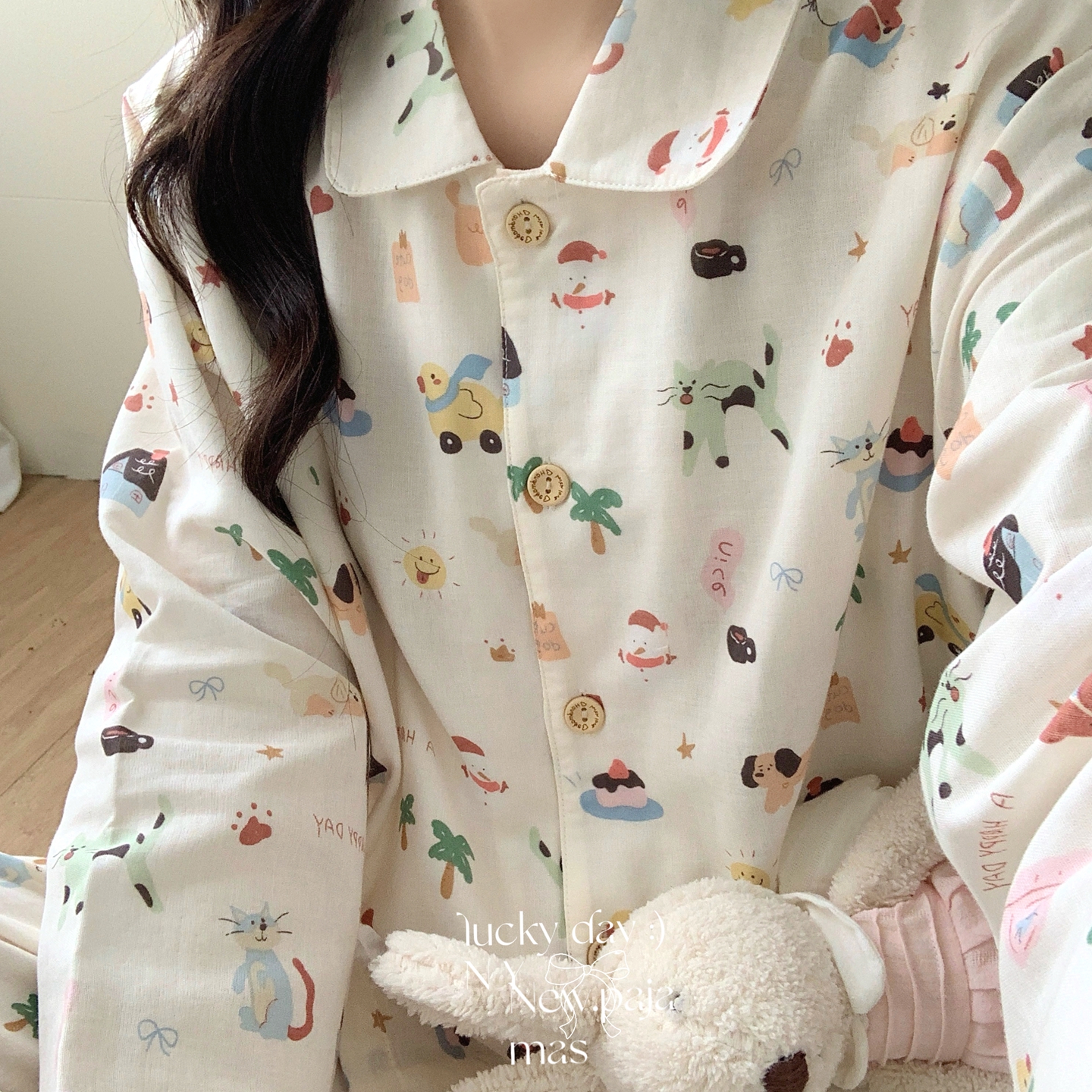 (总)纽约生活 2025新款绉布圆领开扣长袖长裤(会员-5),波比熊,黑碎花猫咪,蝴蝶结粉熊,花花狗,蓝碎花,塞纳花房