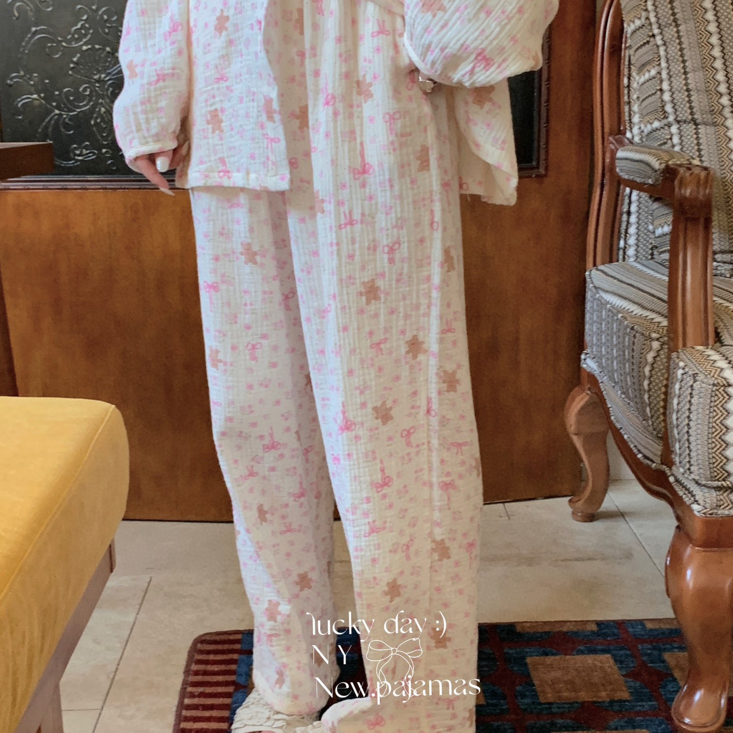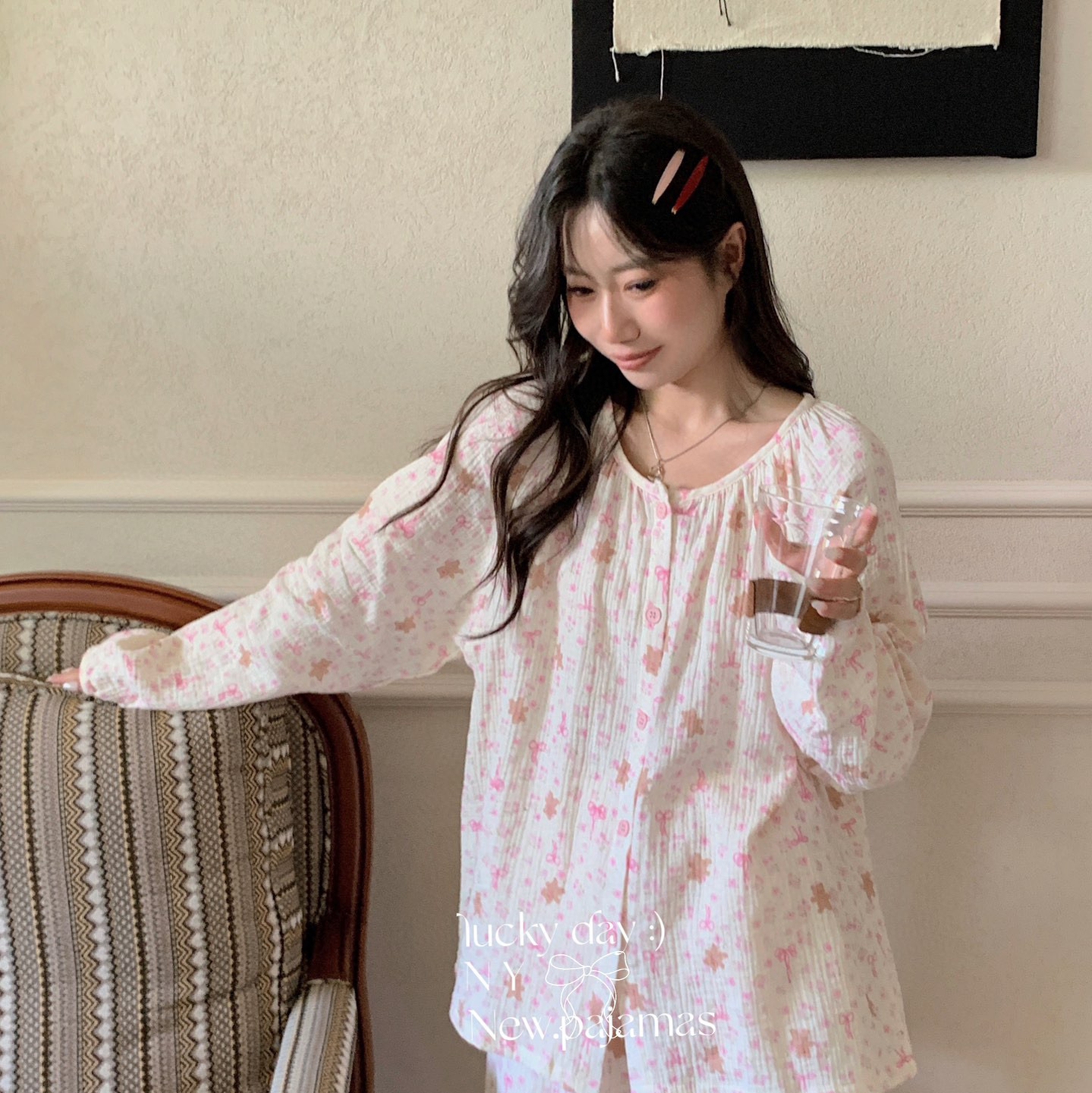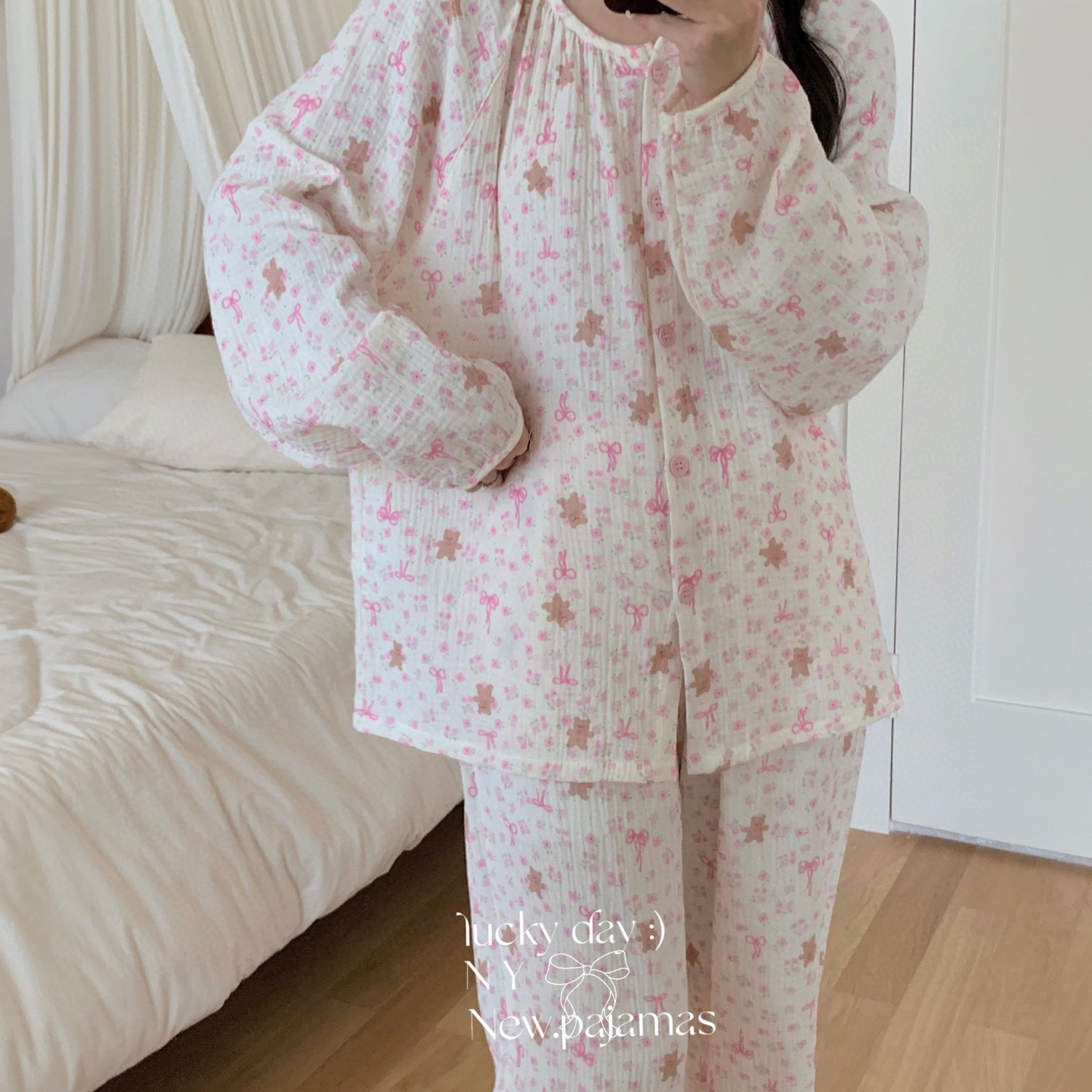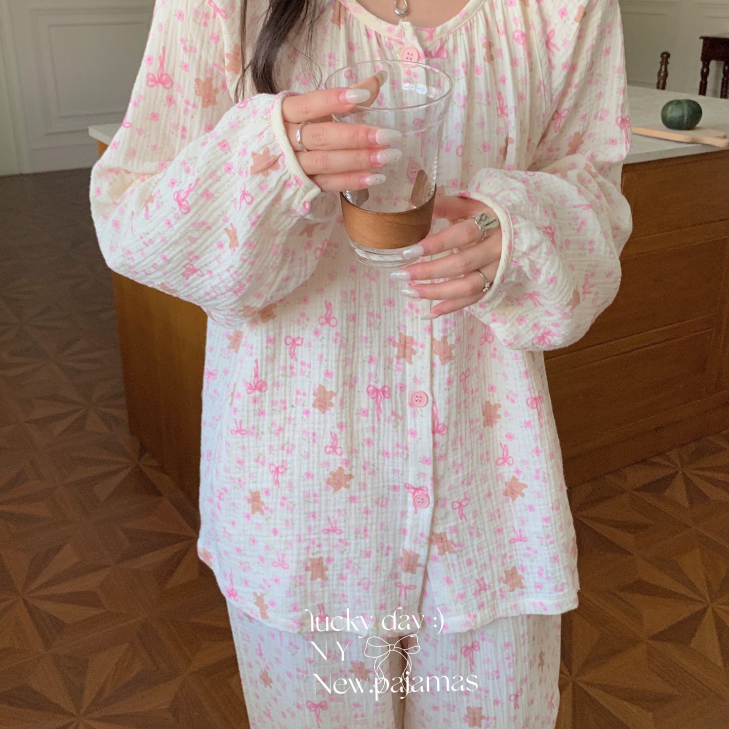 当前位置: 91家纺网 > 商品网购 > 居家日用 > 睡衣/家居服套装 > 纽约生活 2025新款绉布圆领开扣长袖长裤(会员-5) 蝴蝶结粉熊