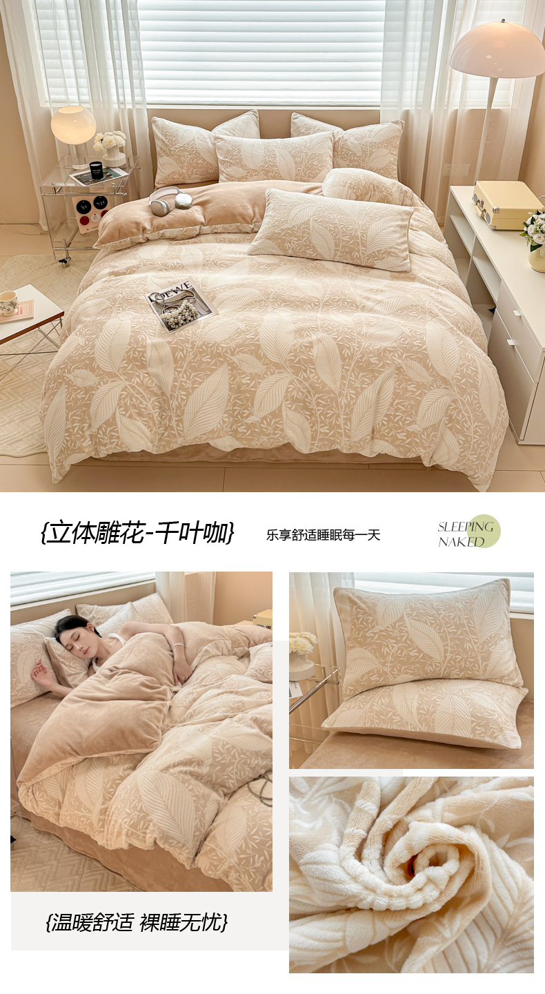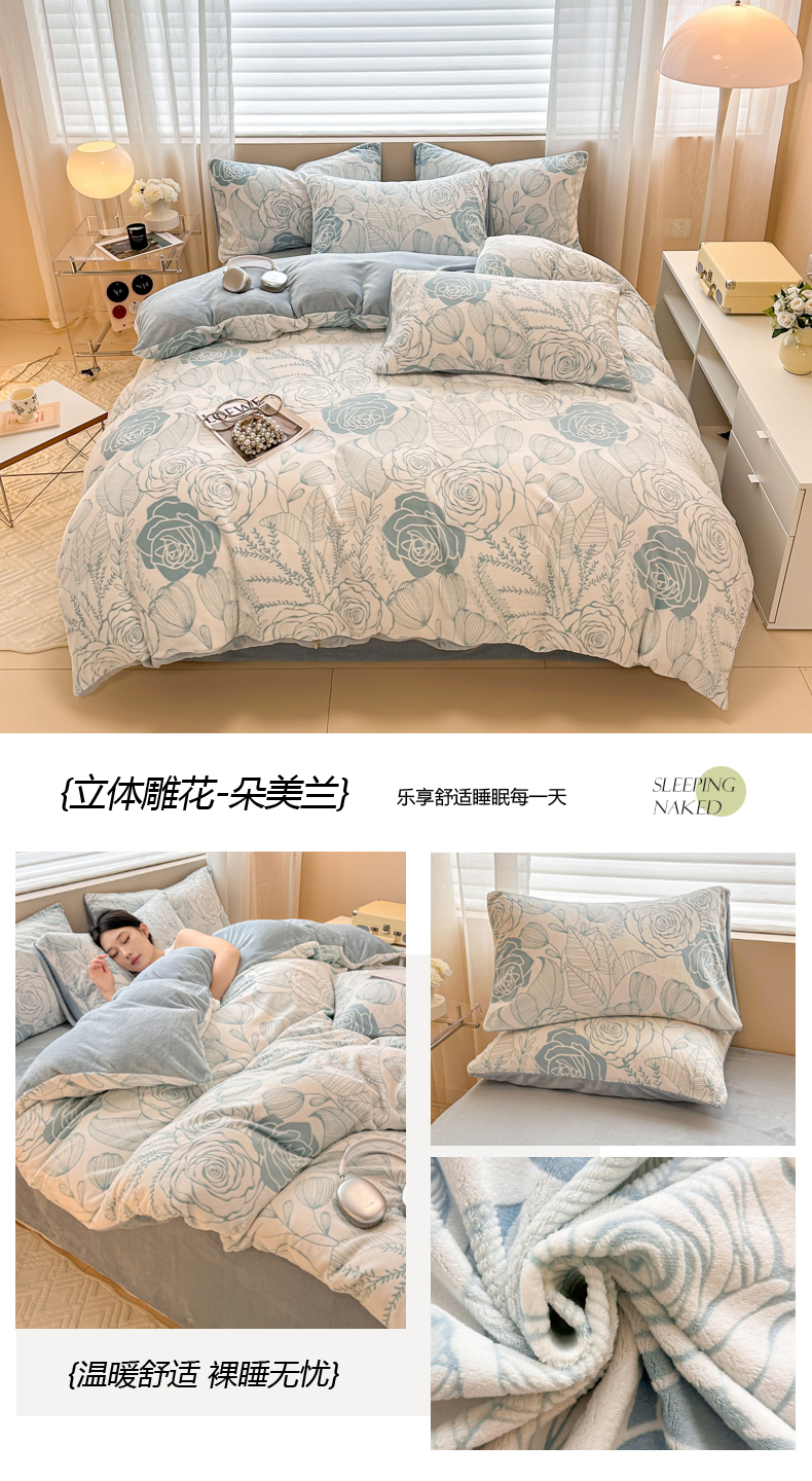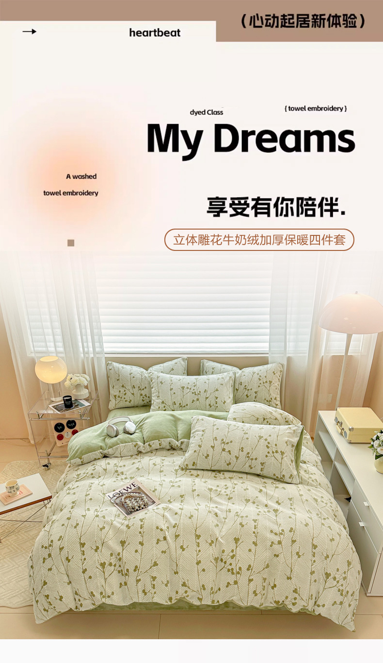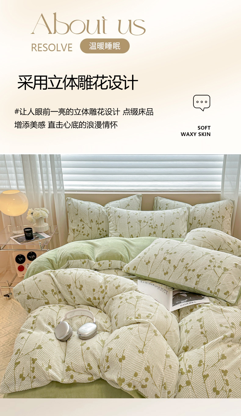 商品名称:眠博士 2025新款立体雕花牛奶绒加厚保暖四件套 立体雕花-米洛绿