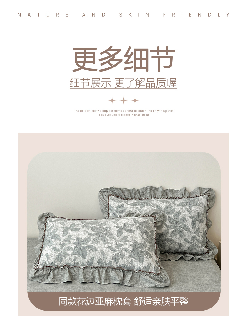 商品名称:逸林家纺《原希尔顿逸林》 2025秋冬新品加厚高克重亚麻复古原麻皱皱纱印花四件套法式花边 叶之舞
