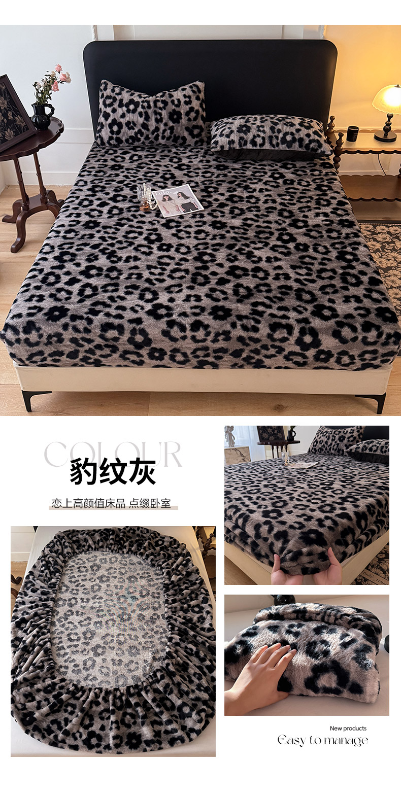 商品名称:绒世界 2025秋冬加厚兔绒床笠 兔绒床笠-豹纹灰