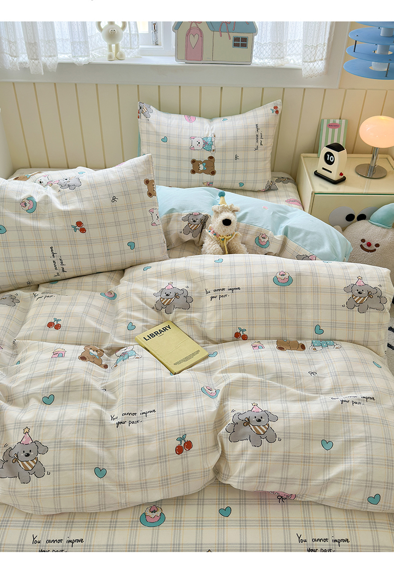当前位置: 91家纺网 > 商品网购 > 床品套件 > 四件套 > 全棉普通四件套 > 典曼家纺 2025新款40支学生季卡通印花四件套 樱桃熊仔
