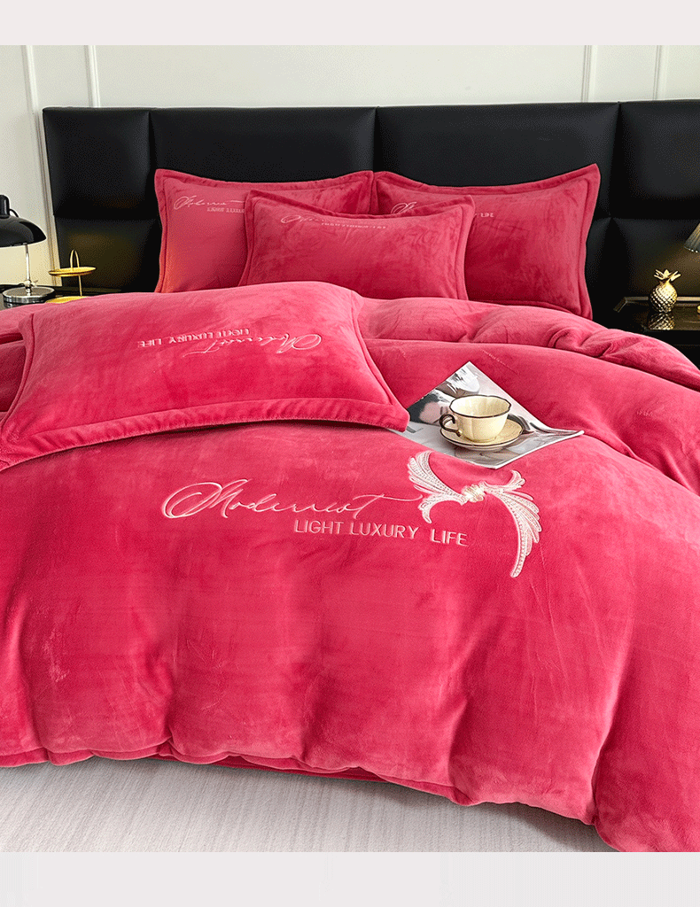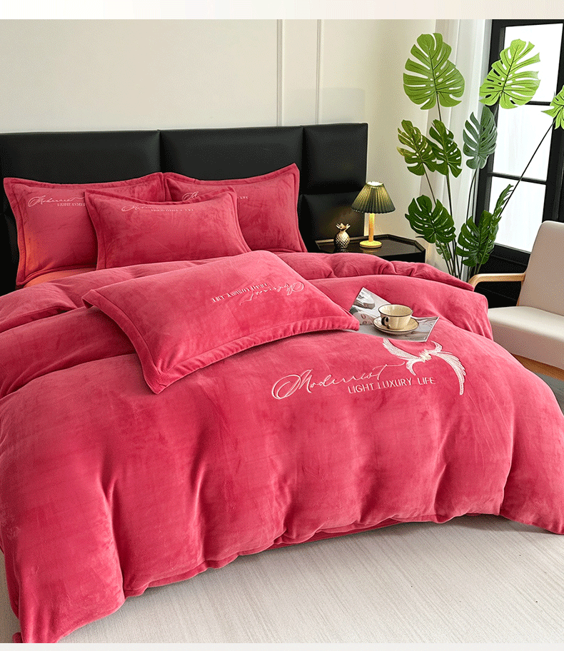 悦织湾家纺 2025新款牛奶绒纯色刺绣四件套-宽镜 宽镜-豆沙