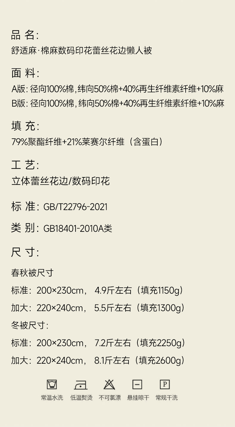 商品名称:桂雅居 2025新款舒适麻棉麻数码印花蕾丝花边懒人被被子被芯 映雪咖