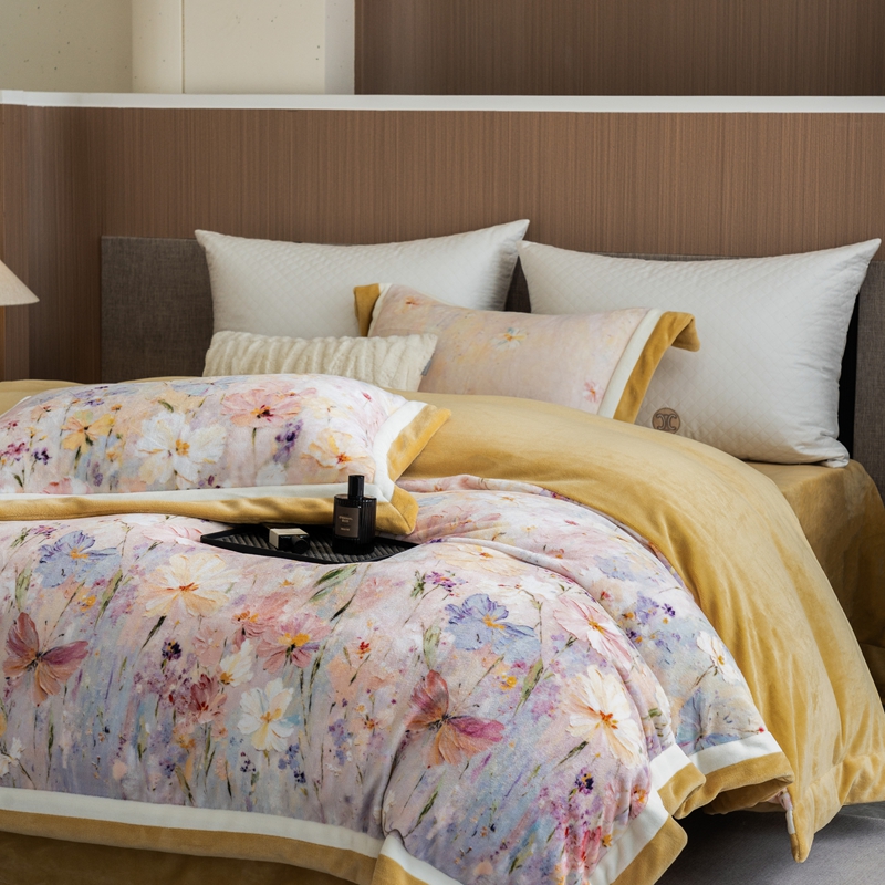 瑞雪家居 2025新款全消光数码印花牛奶绒系列四件套 花语黄