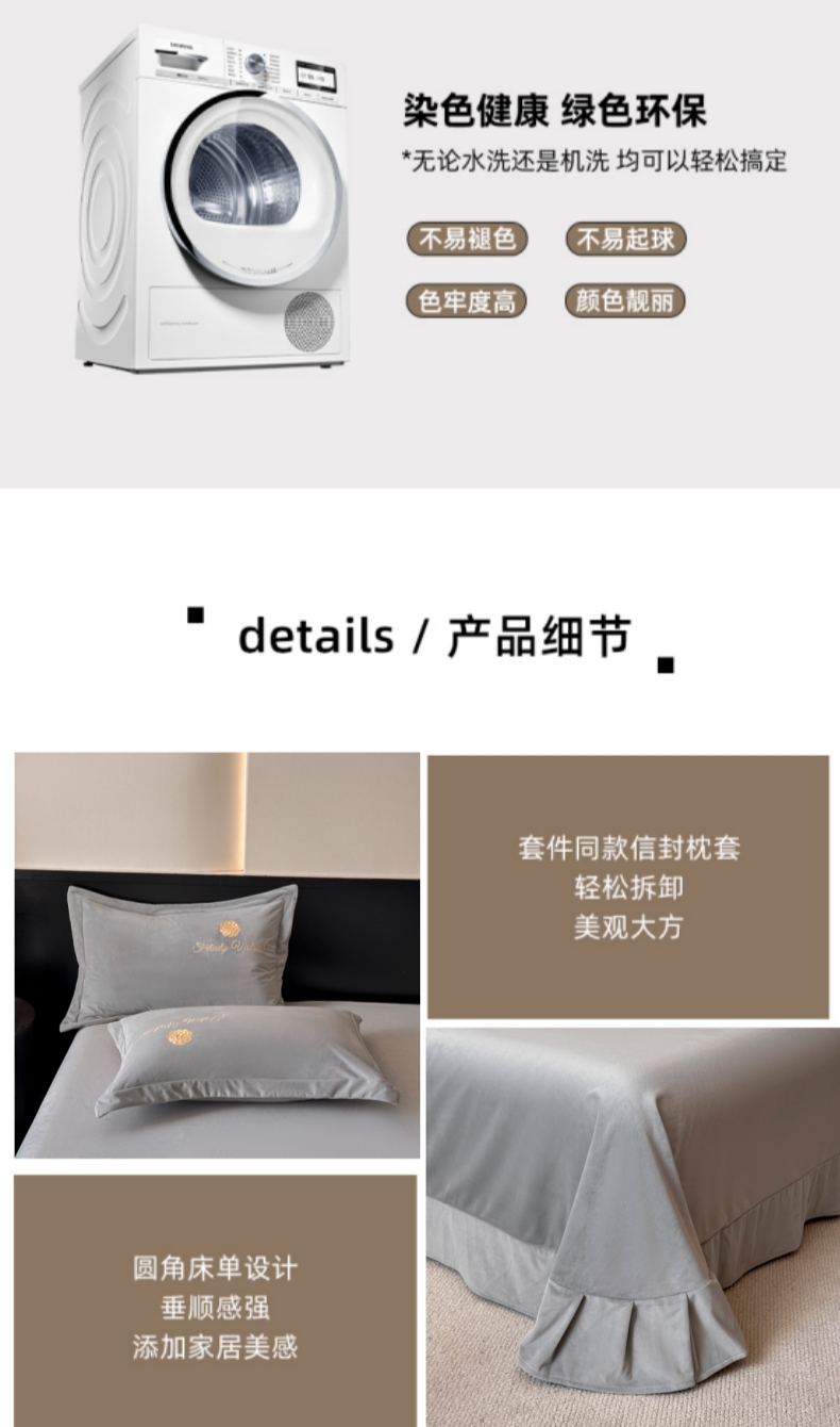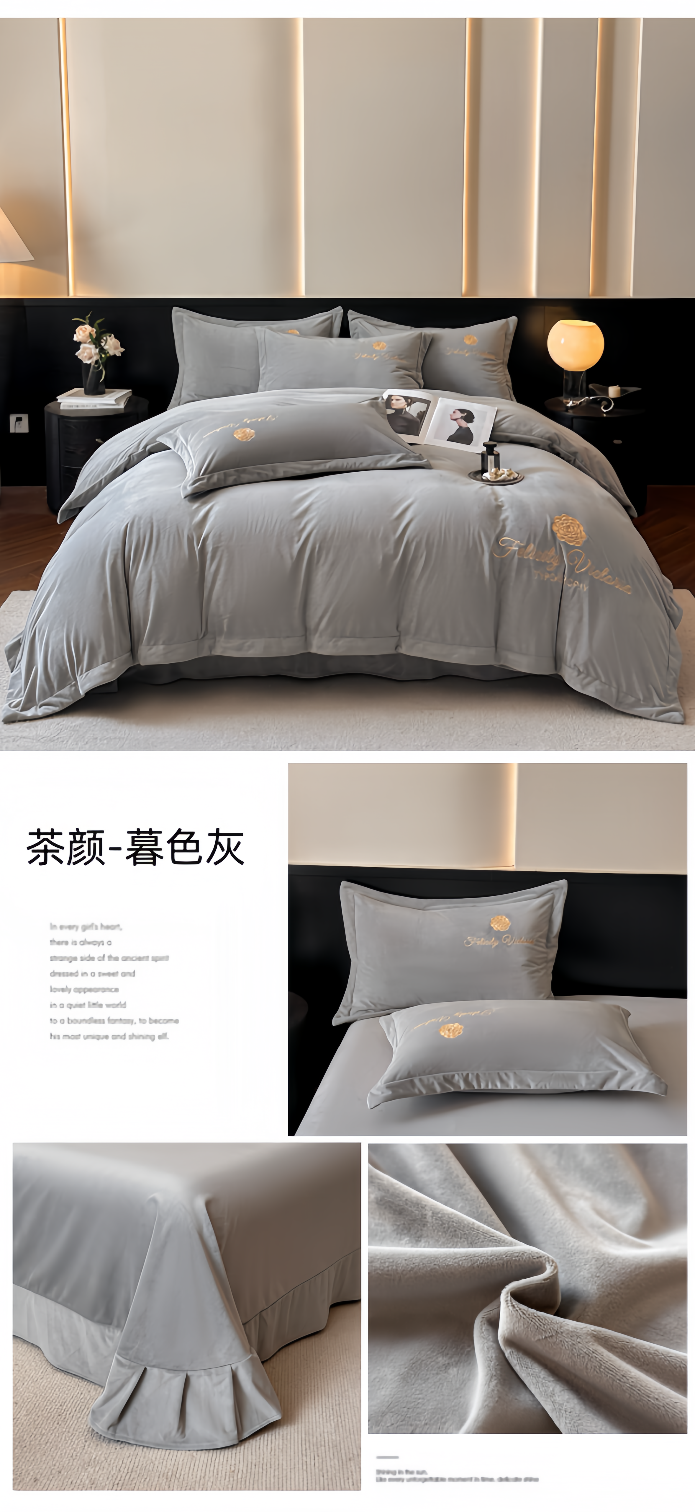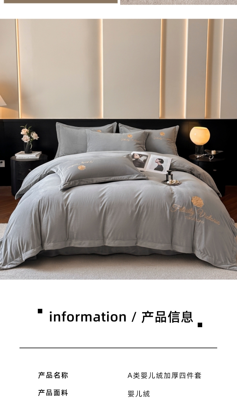 商品名称:鸿织源2025新款-茶颜系列 宝宝绒宽边四件套 茶颜-暮色灰