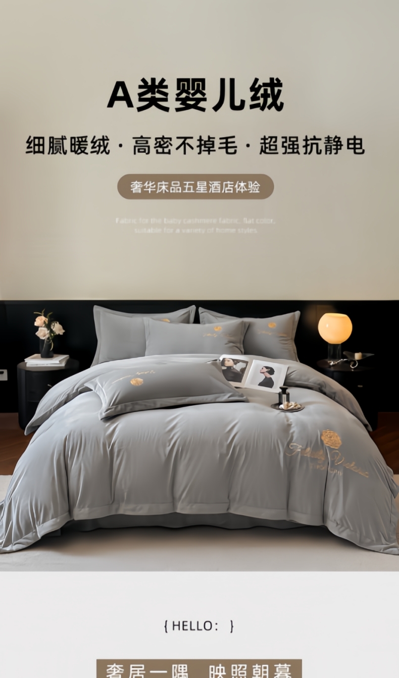 鸿织源2025新款-茶颜系列 宝宝绒宽边四件套 茶颜-暮色灰