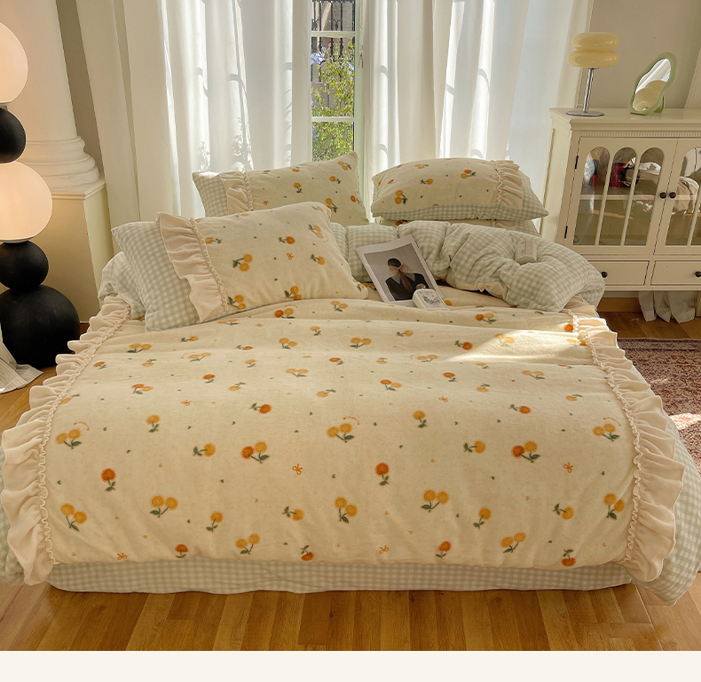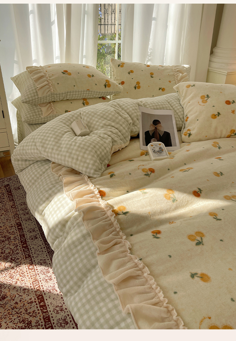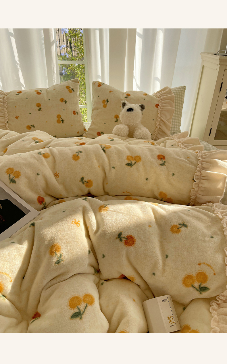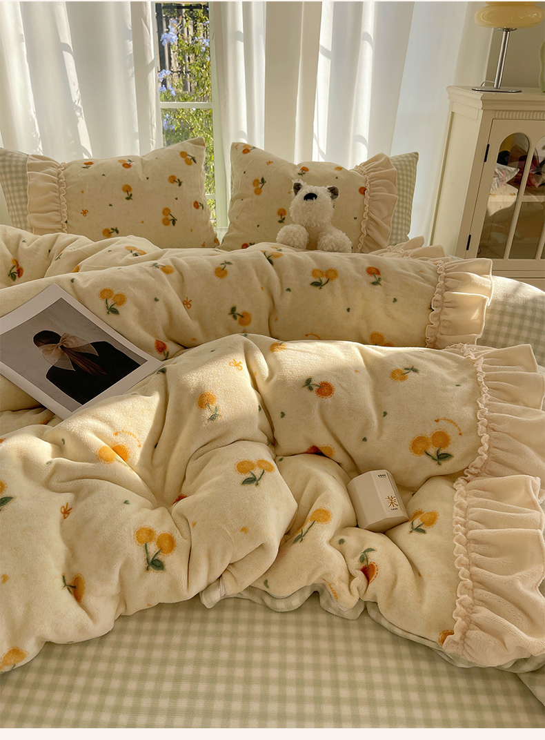 商品名称:瑞莱 (持续上新)2025冬季新款拼接款花边牛奶绒四件套 奶油樱桃