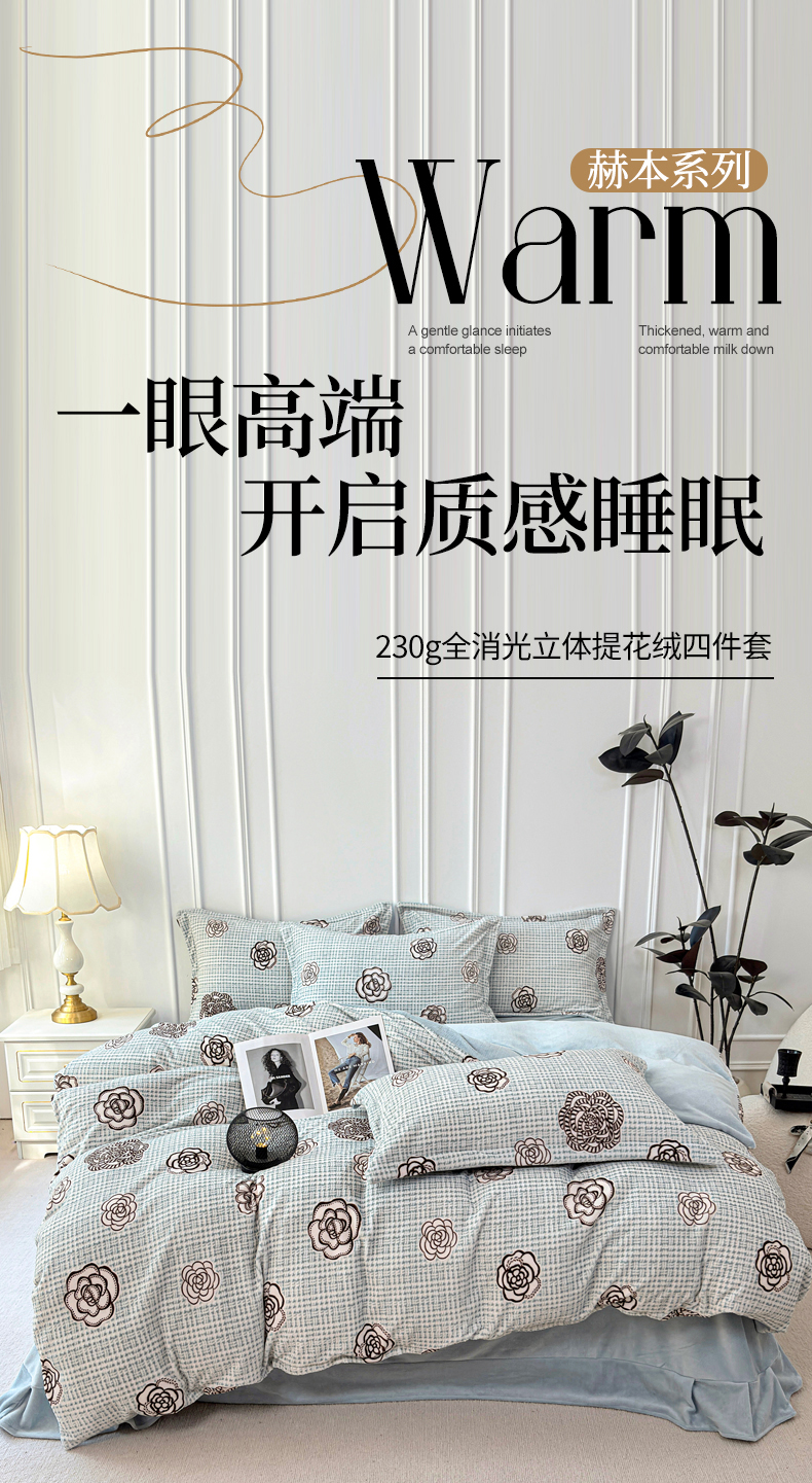 • 91家纺网 家纺一手货源 找家纺 未来家居 2025新款赫本风印花款提花绒四件套 菱香