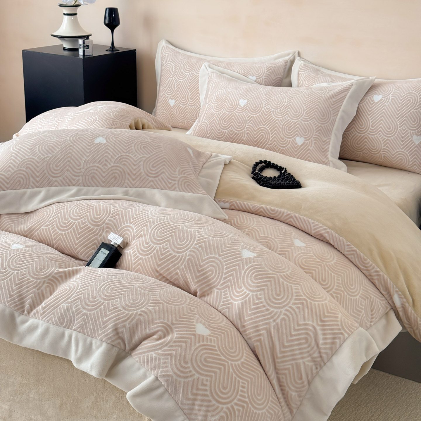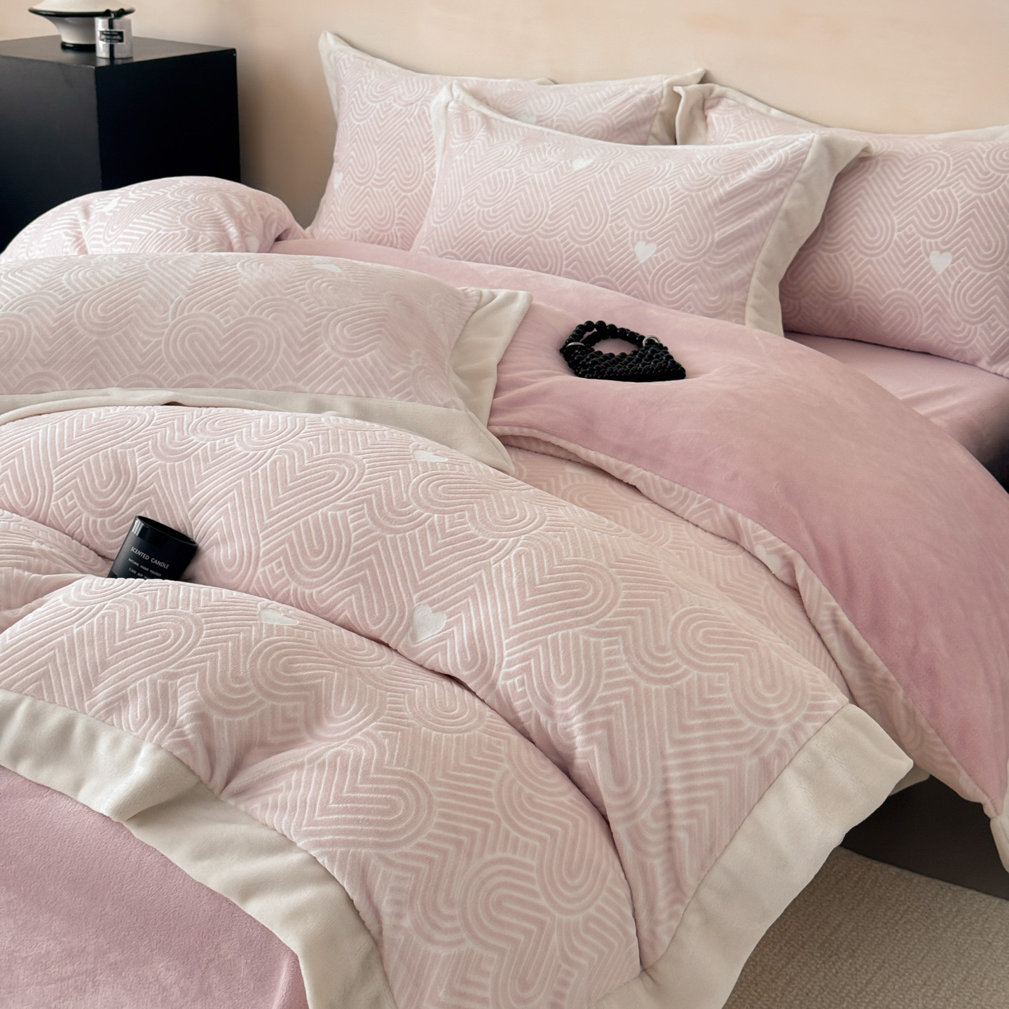 (总)若未家居 LOVEWE HOUSE 2025新款250克全消光数码印花5D雕花撞色宽边全消光牛奶绒四件套-心动