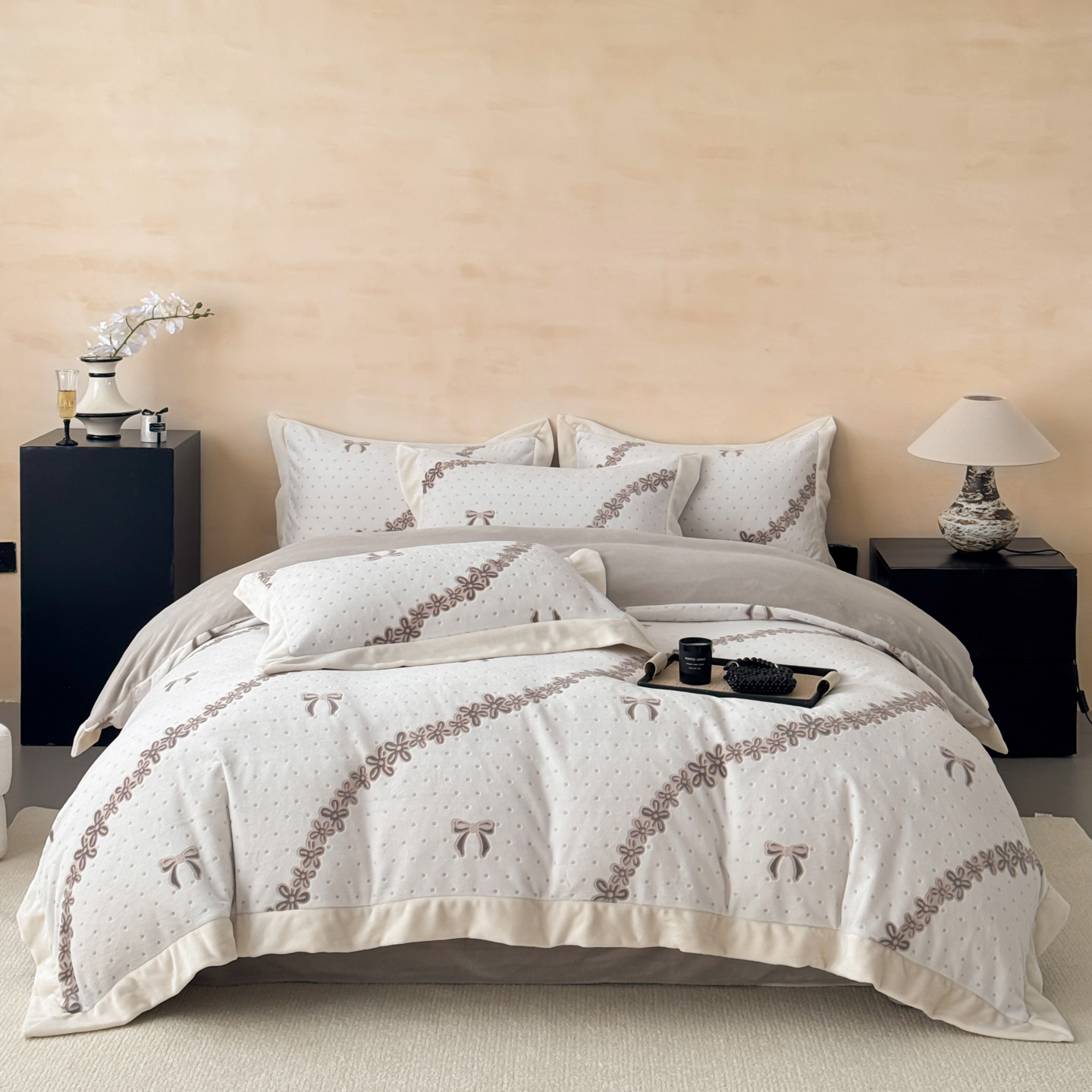 若未家居 LOVEWE HOUSE 2025新款250克全消光数码印花和雕花大宽边全消光牛奶绒四件套-波点蝴蝶结 波点蝴蝶结-绿