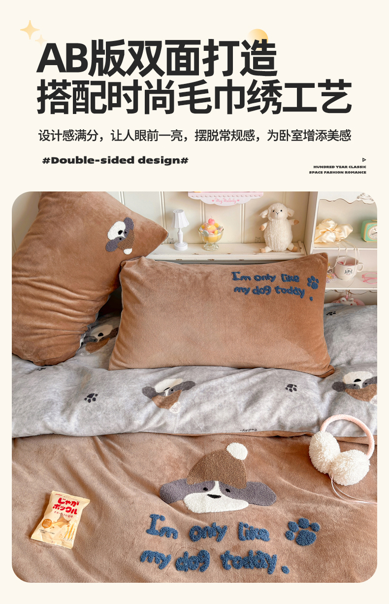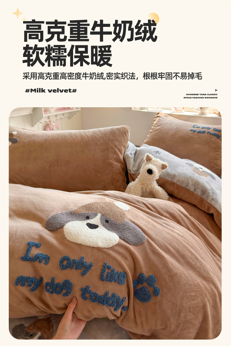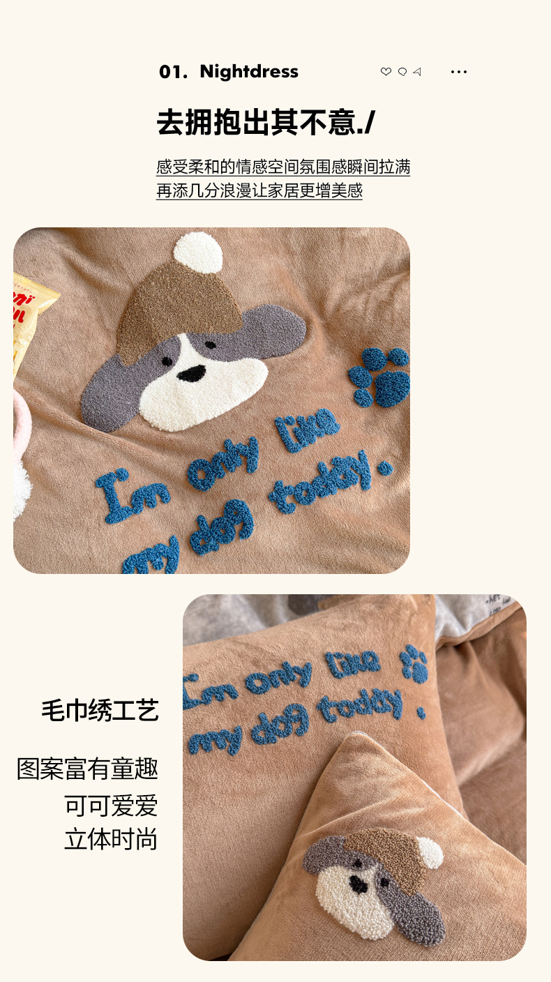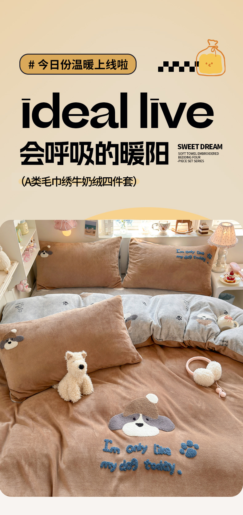 商品名称:Sweet dreams甜梦 2025新款全消光牛奶绒毛巾绣印花四件套 帽子小狗