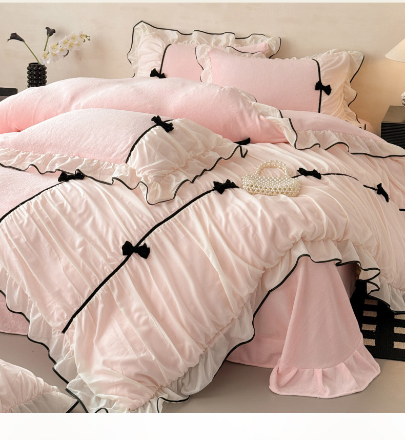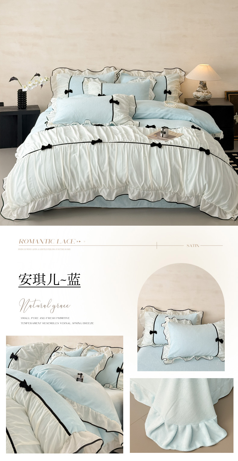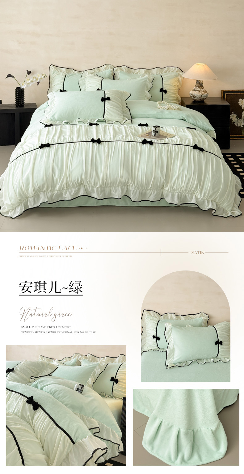 (总)米可 2025新款立体蝴蝶结公主风牛奶绒蕾丝花边四件套-艾拉系列二,艾拉-粉玉,艾拉-米黄,艾拉-浅蓝,艾拉-浅绿,艾拉-浅紫