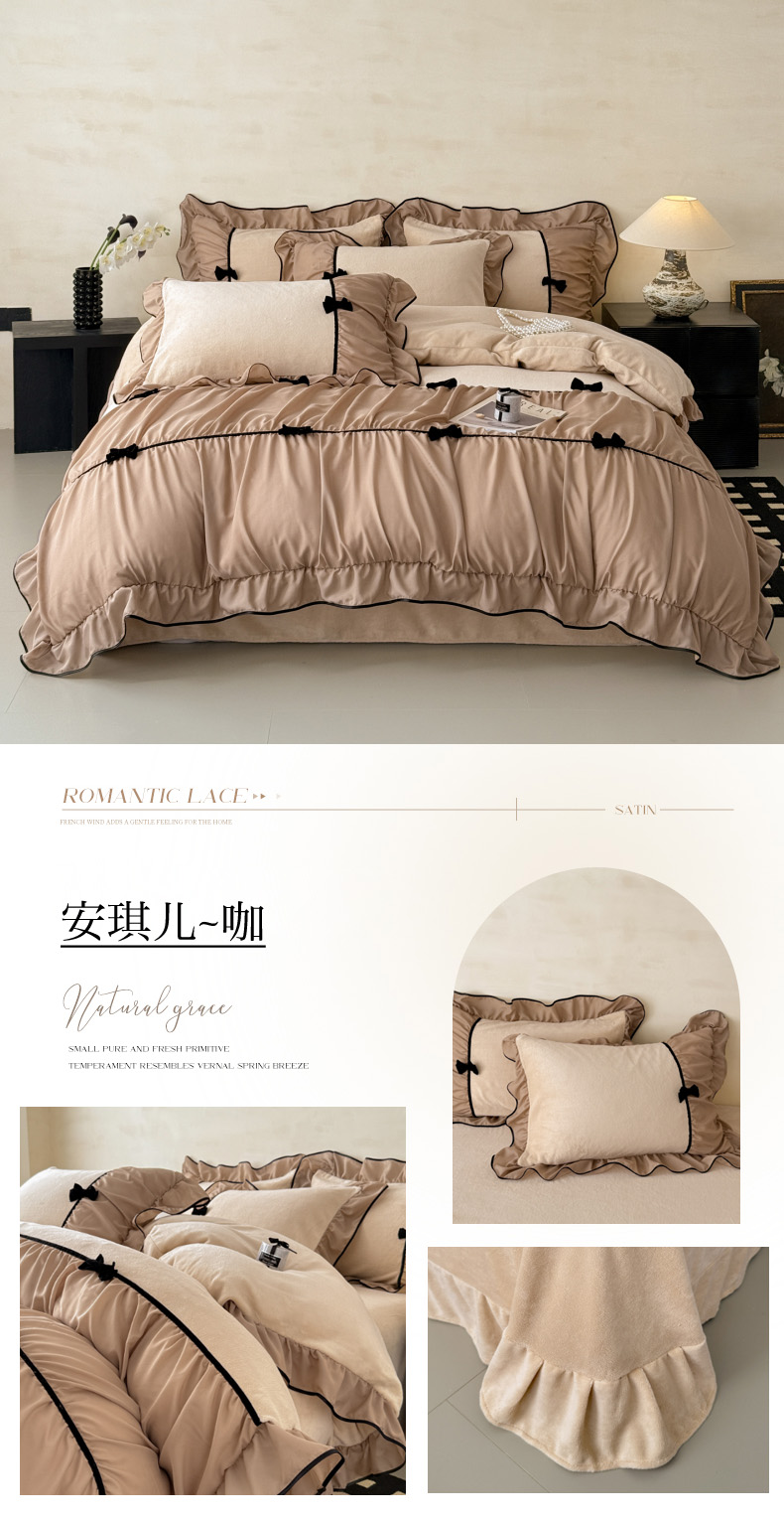 (总)米可 2025新款牛奶绒蕾丝花边四件套韩版法式公主风四件套~ 安琪儿系列,安琪儿~咖,安琪儿~白,安琪儿~粉,安琪儿~蓝,安琪儿~绿,安琪儿~紫