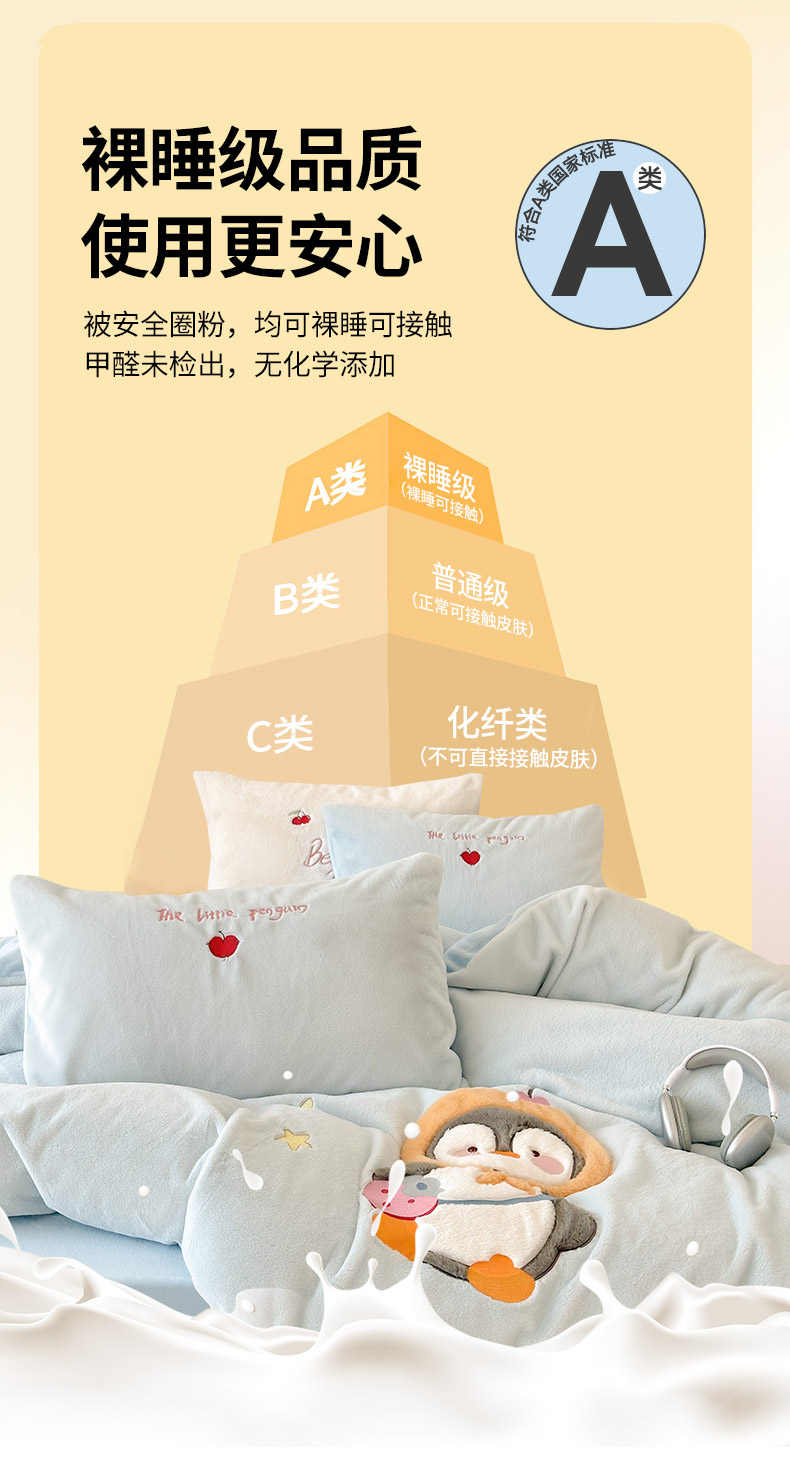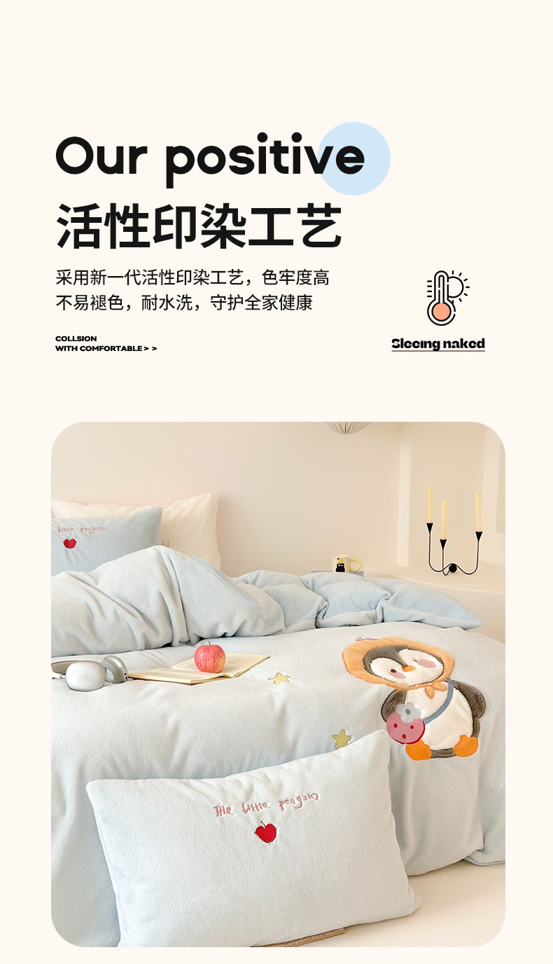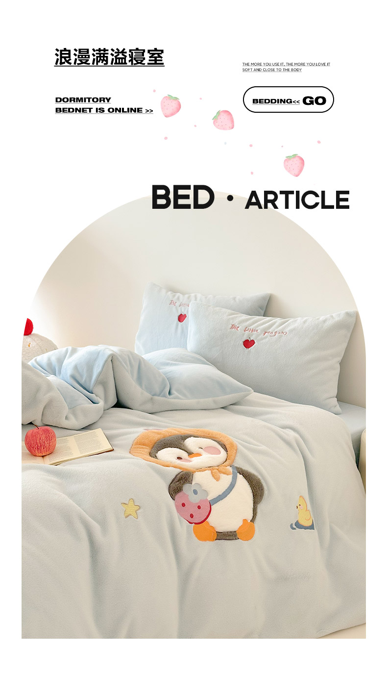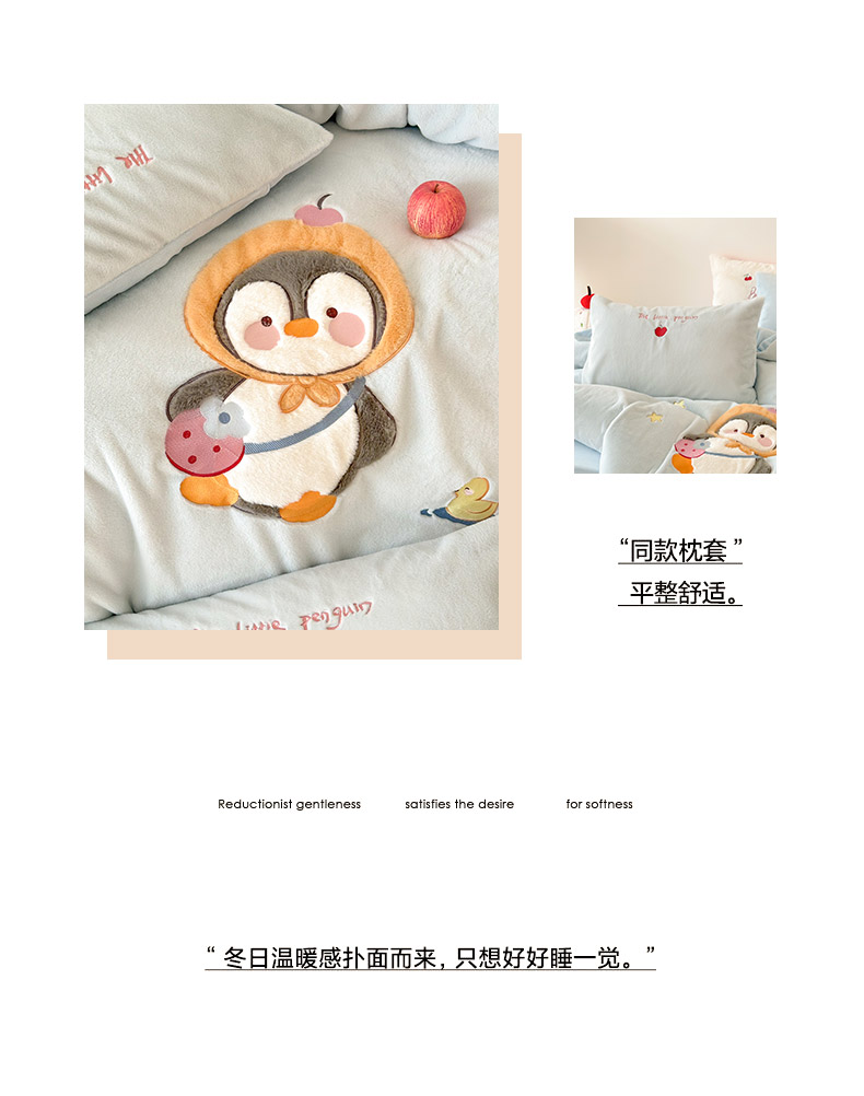 商品名称:色鬼布艺高端家居主号 2025新款兔毛绒牛奶绒四件套系列 快乐企鹅