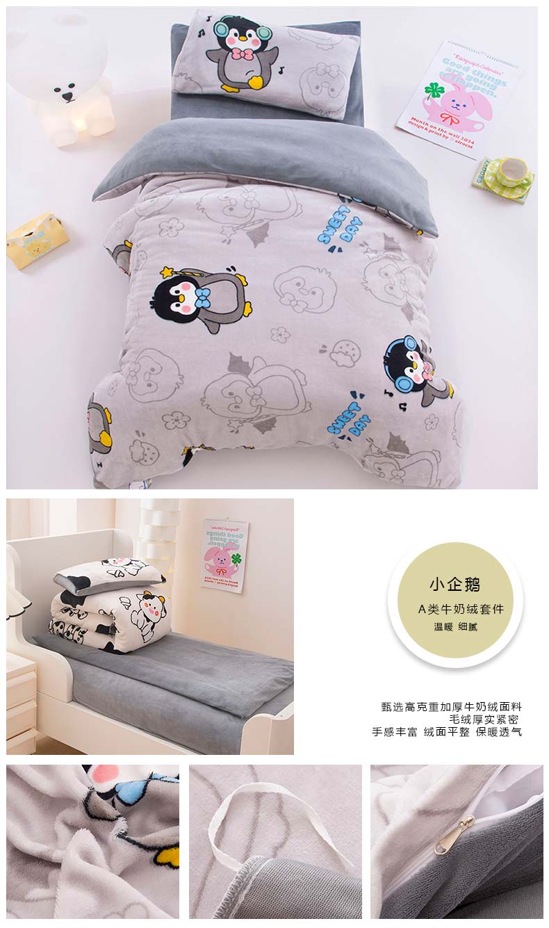 当前位置: 91家纺网 > 商品网购 > 床品套件 > 三件套 > 萌宝家纺 2025新款加厚儿童牛奶绒被套幼儿园保暖三件套 小企鹅