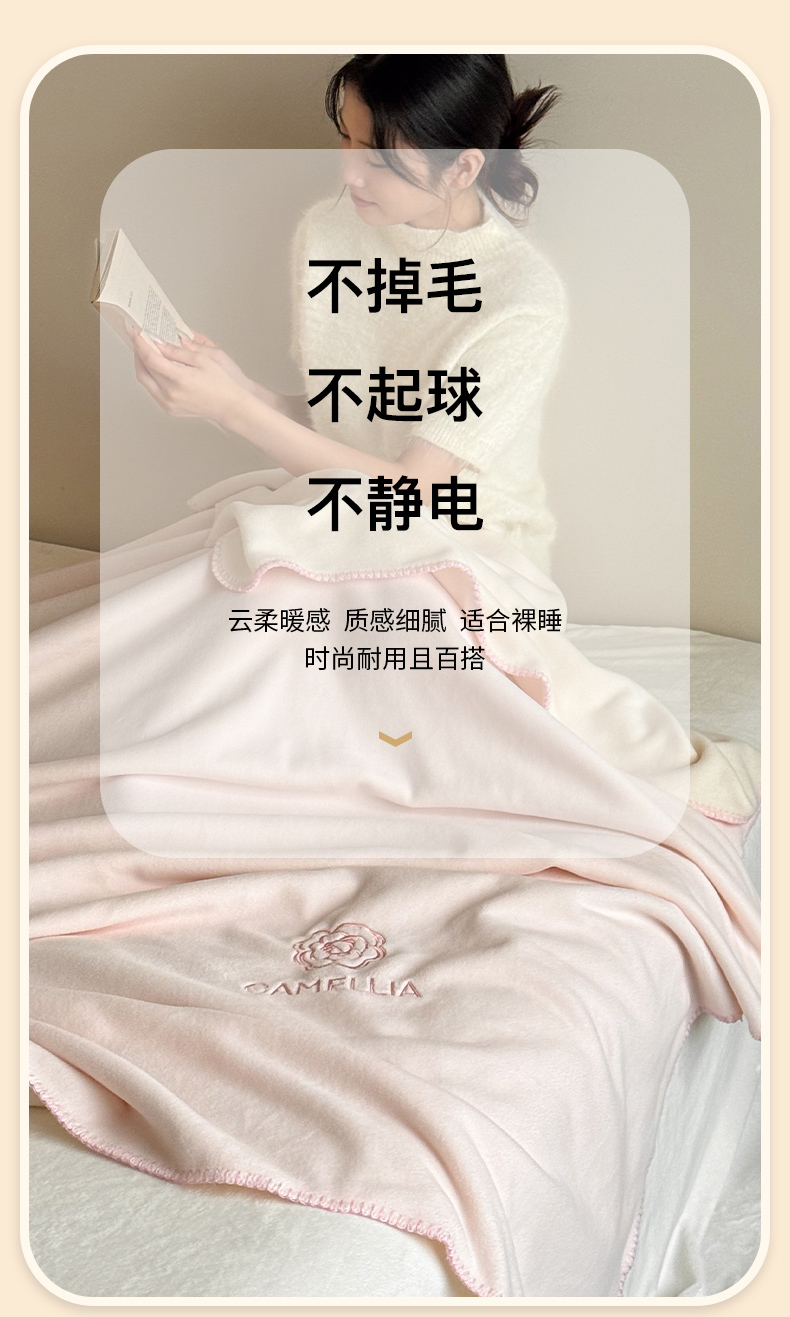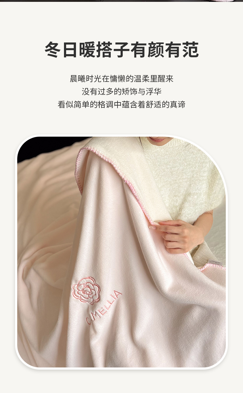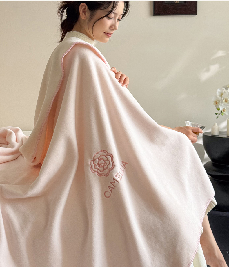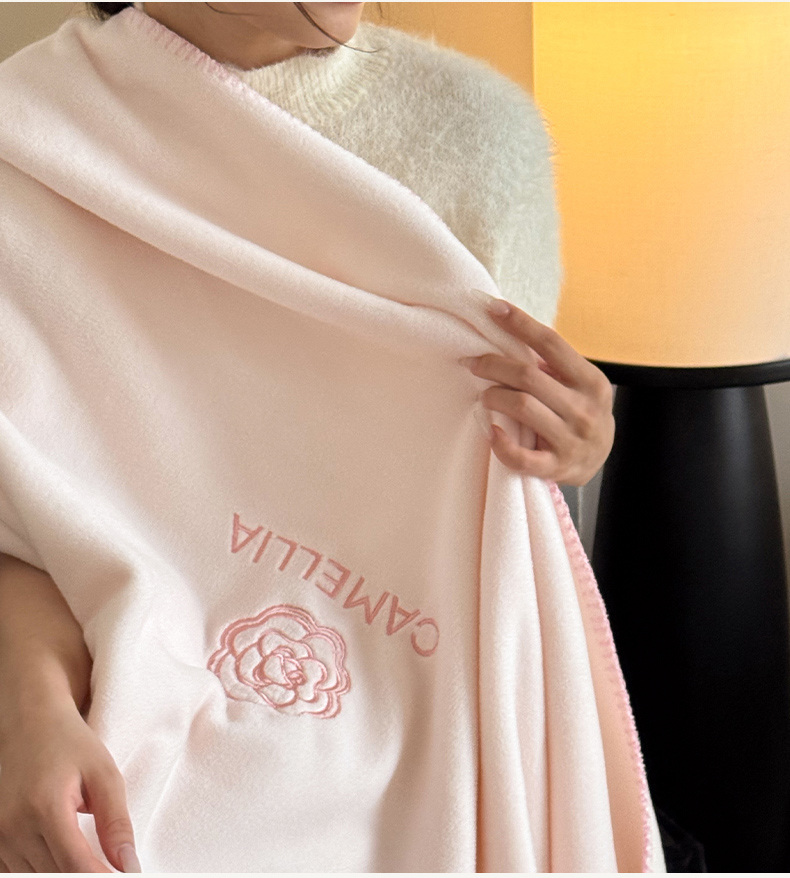 商品名称:云栖家居 2025新品双层加厚高克重消光沙发毯仿羊绒纯色刺绣盖毛毯毯子 山茶-粉