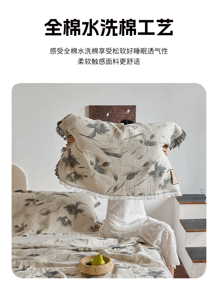 (总)沐瑟家纺 2025新款简约风多功能纱布盖毯纱布毯子毛巾被床盖沙发巾单毯枕巾枕套三件套,H本色,H橙色,H咖色,大马士革本色