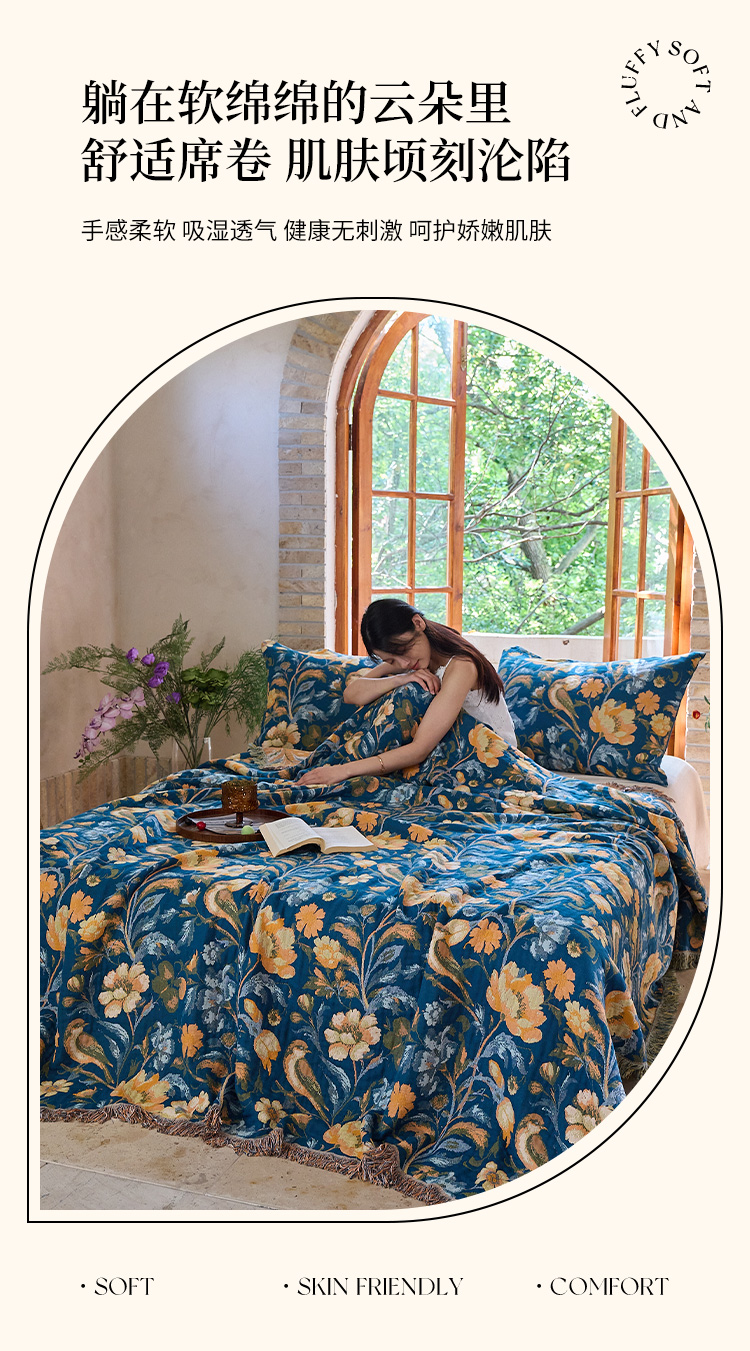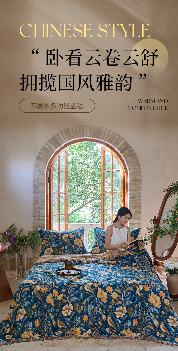 商品名称:沐瑟家纺 2025新款亲肤柔软全棉纱布中国风盖毯毯子 花鸟韵