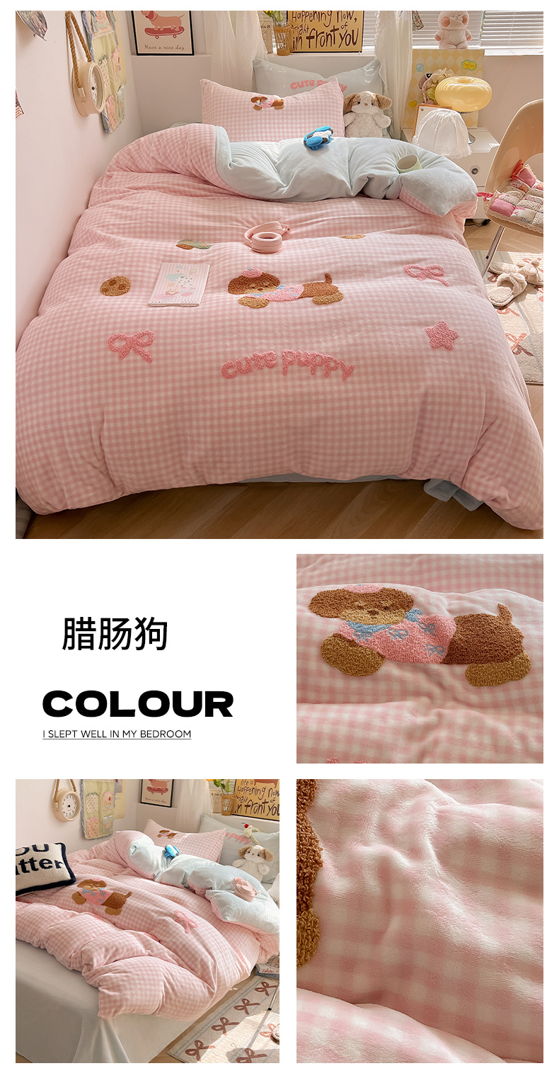 (总)韩都家居 2025新款卡通贴布绣系列加厚牛奶绒四件套,乖乖兔,冬日猫咪,苹果狗狗,绅士小狗,顽皮西高地,幸运小熊