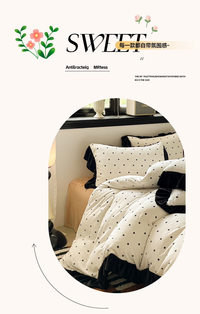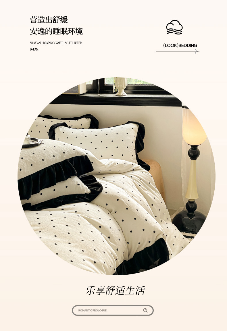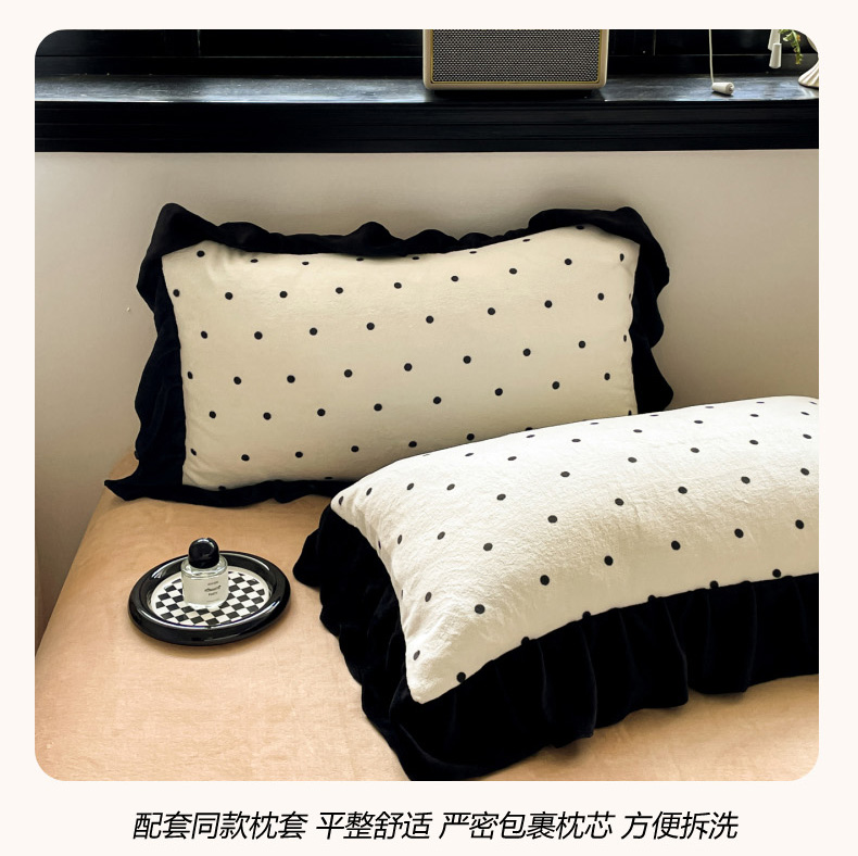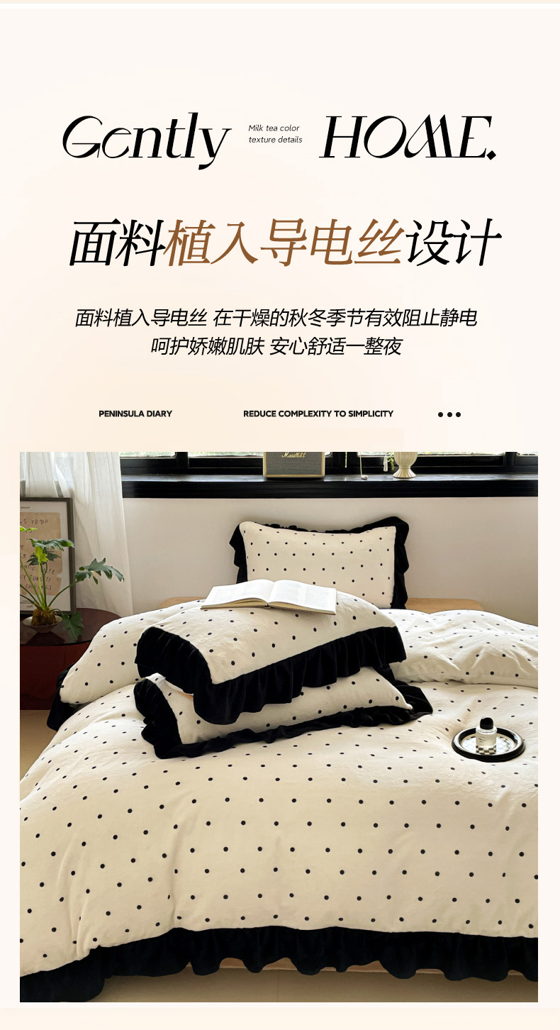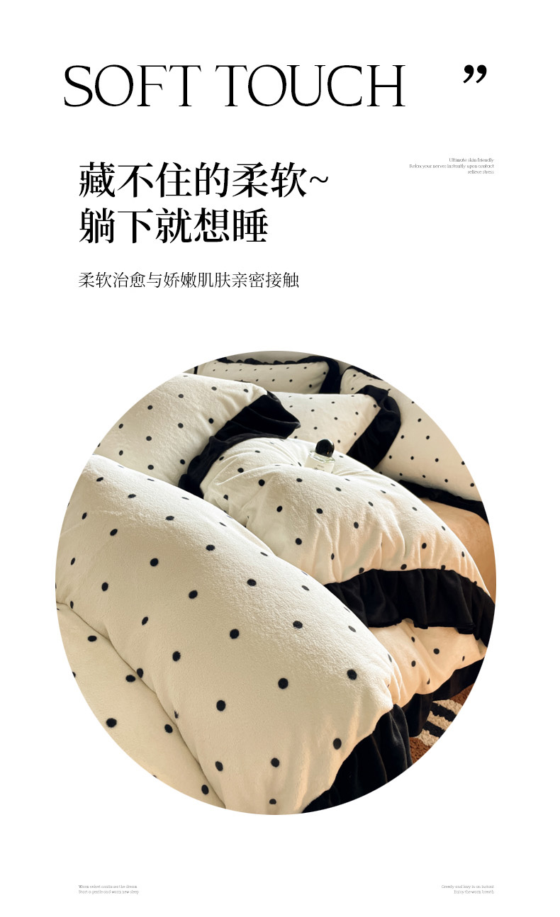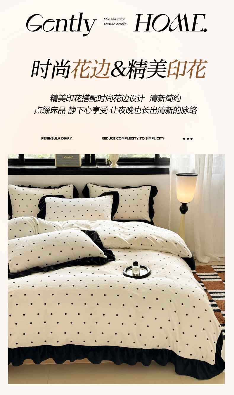 当前位置: 91家纺网 > 商品网购 > 床品套件 > 四件套 > 牛奶绒四件套 > 慕澄家纺 2025新款赫本风牛奶绒花边款四件套 花边款-点点浪漫