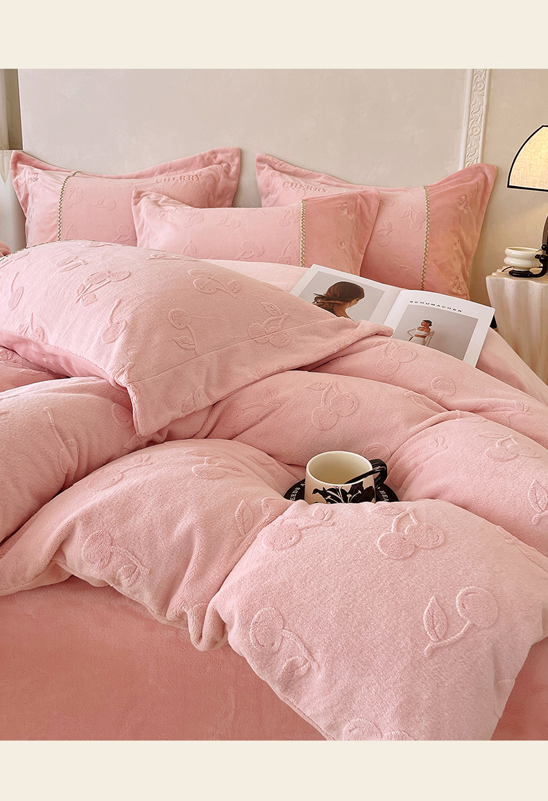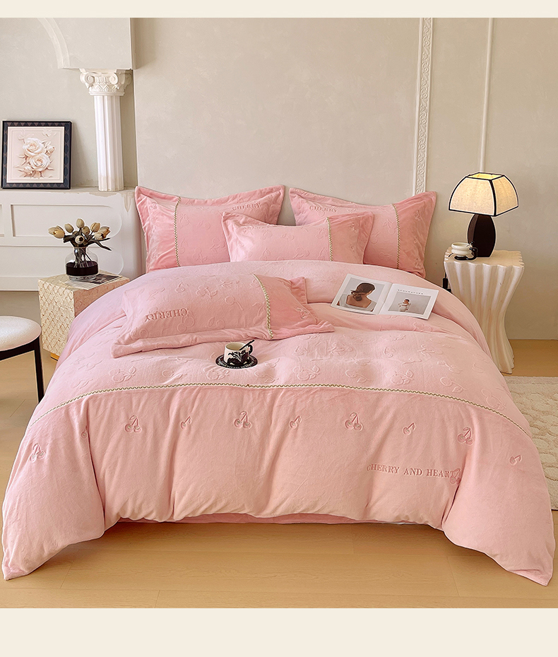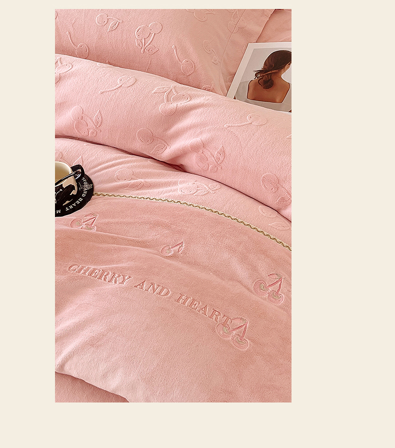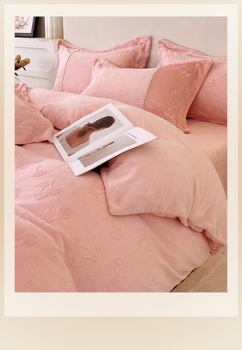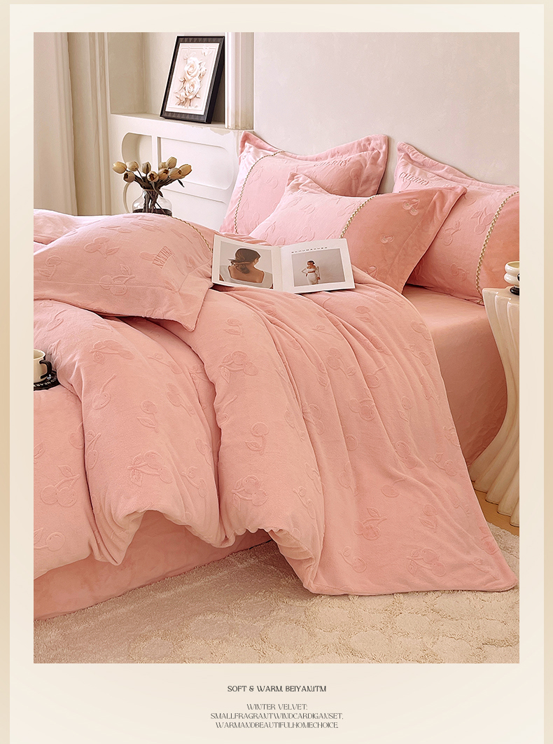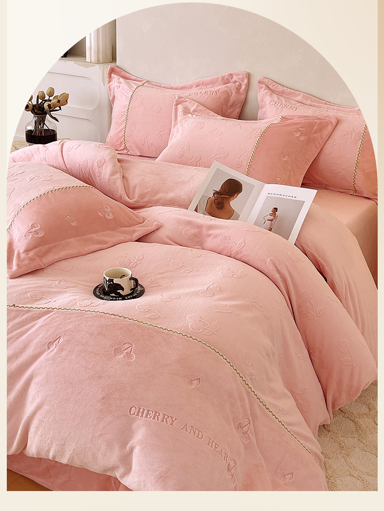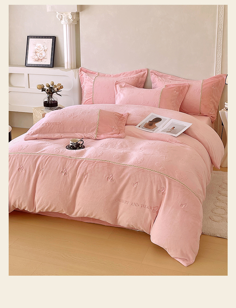 (总)鼎飞家纺 2025新款高克重牛奶绒立体烂花+刺绣四件套--初恋樱桃系列
