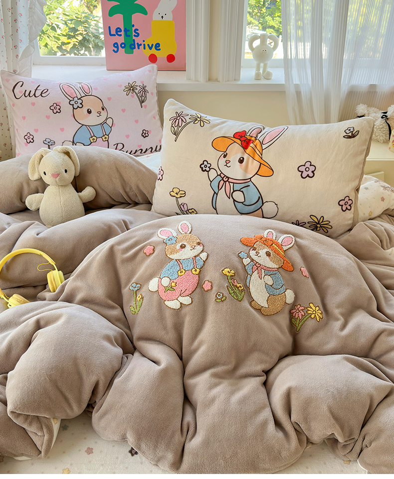 (总)一霖家纺 2025新款小清新牛奶绒毛巾绣四件套-第三波,调皮的小熊,波点小熊,花园小兔咖,小猪派派,樱桃兔,波点米菲兔,彩色小猫