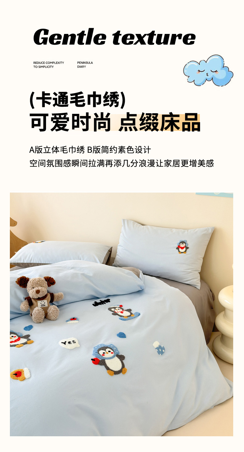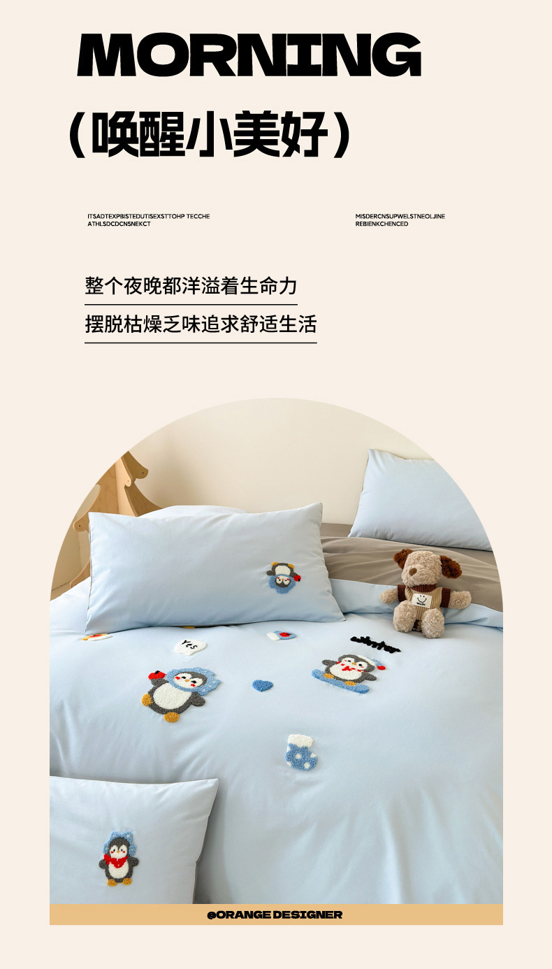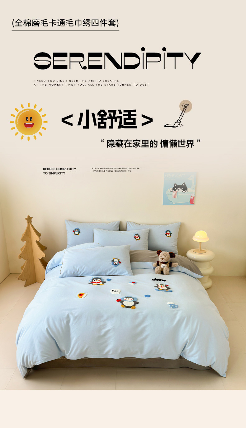 当前位置: 91家纺网 > 商品网购 > 床品套件 > 四件套 > 全棉普通四件套 > 如意朵 2025新款全棉加厚磨毛绣花四件套风格一(专版花型) 追梦企鹅蓝