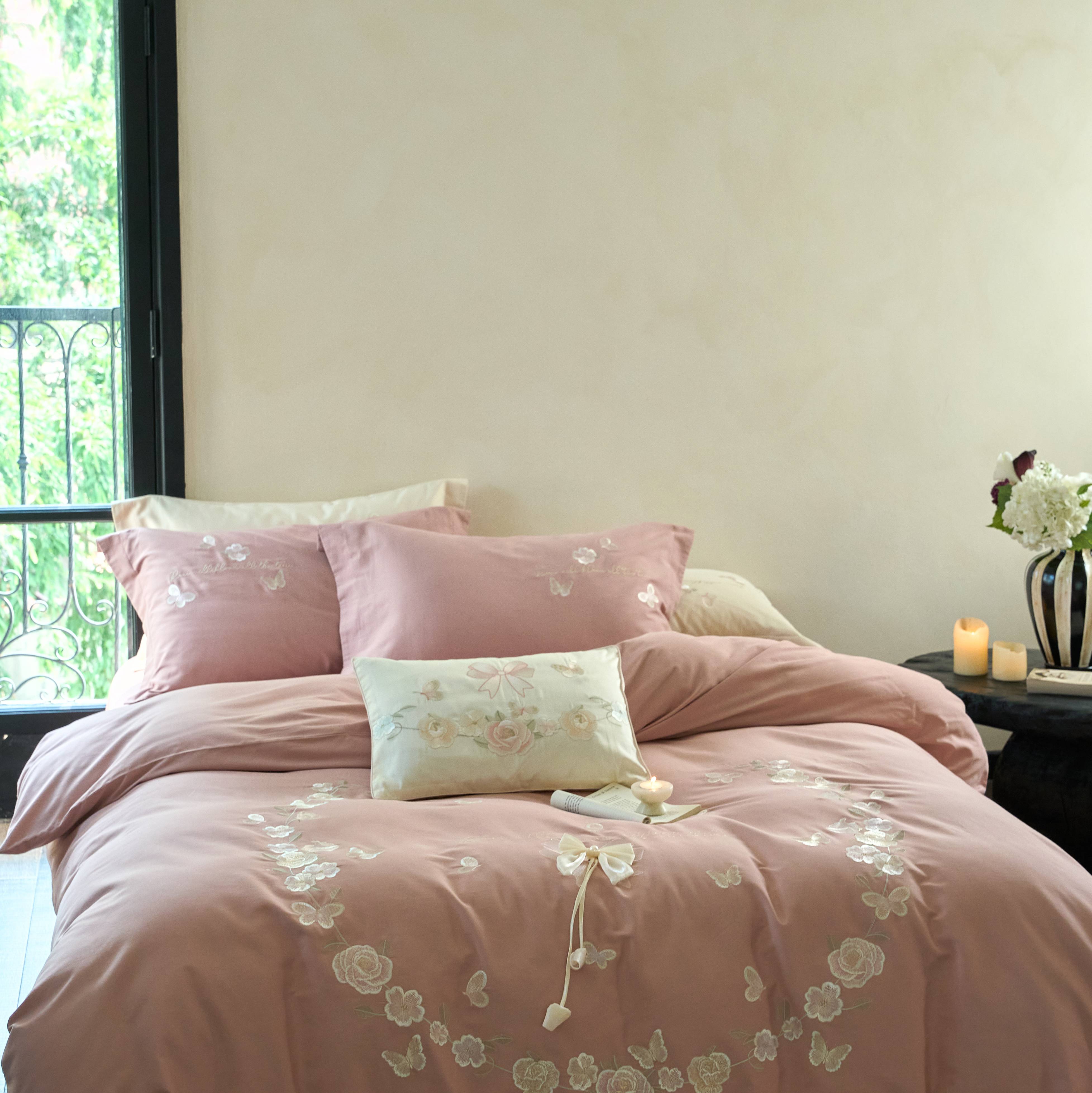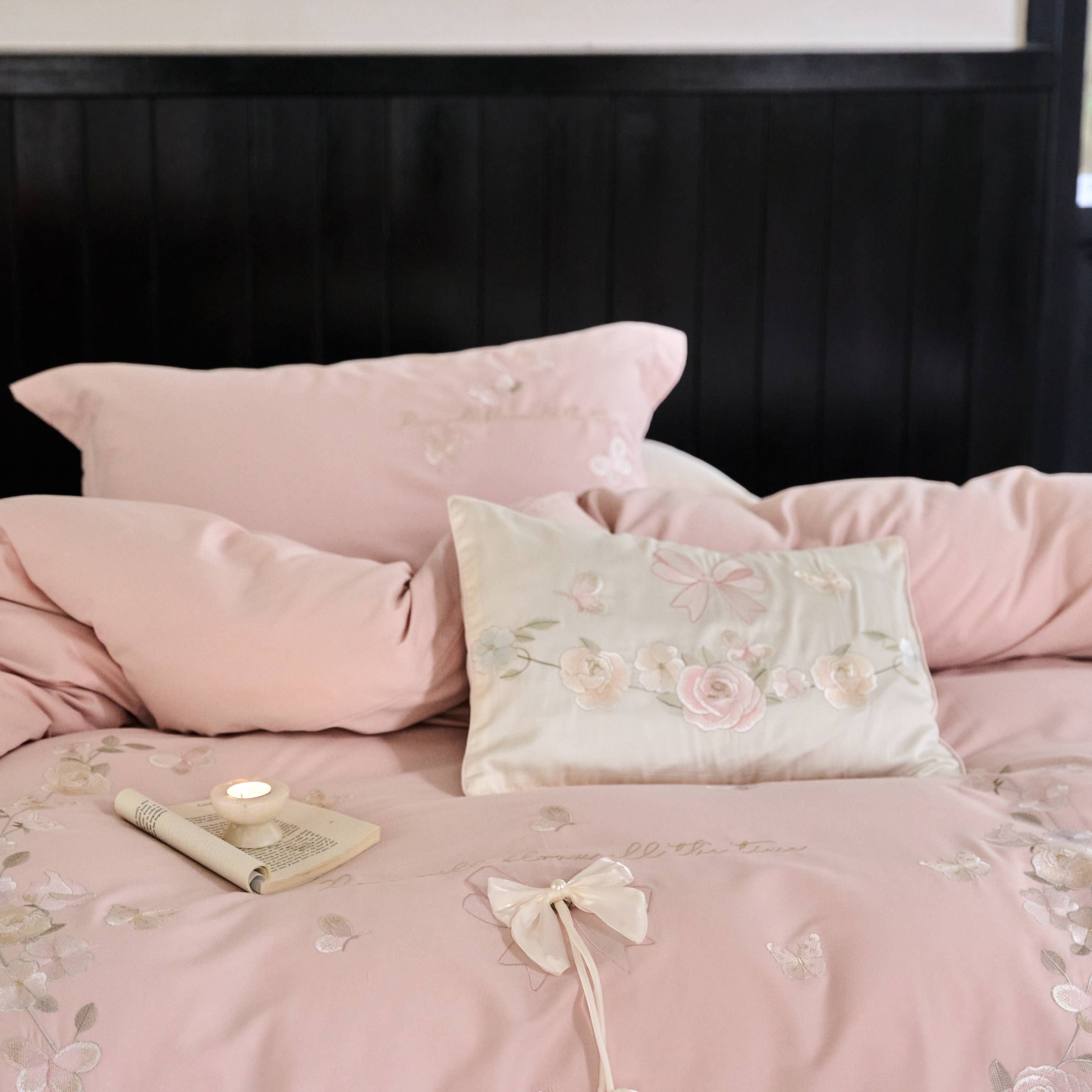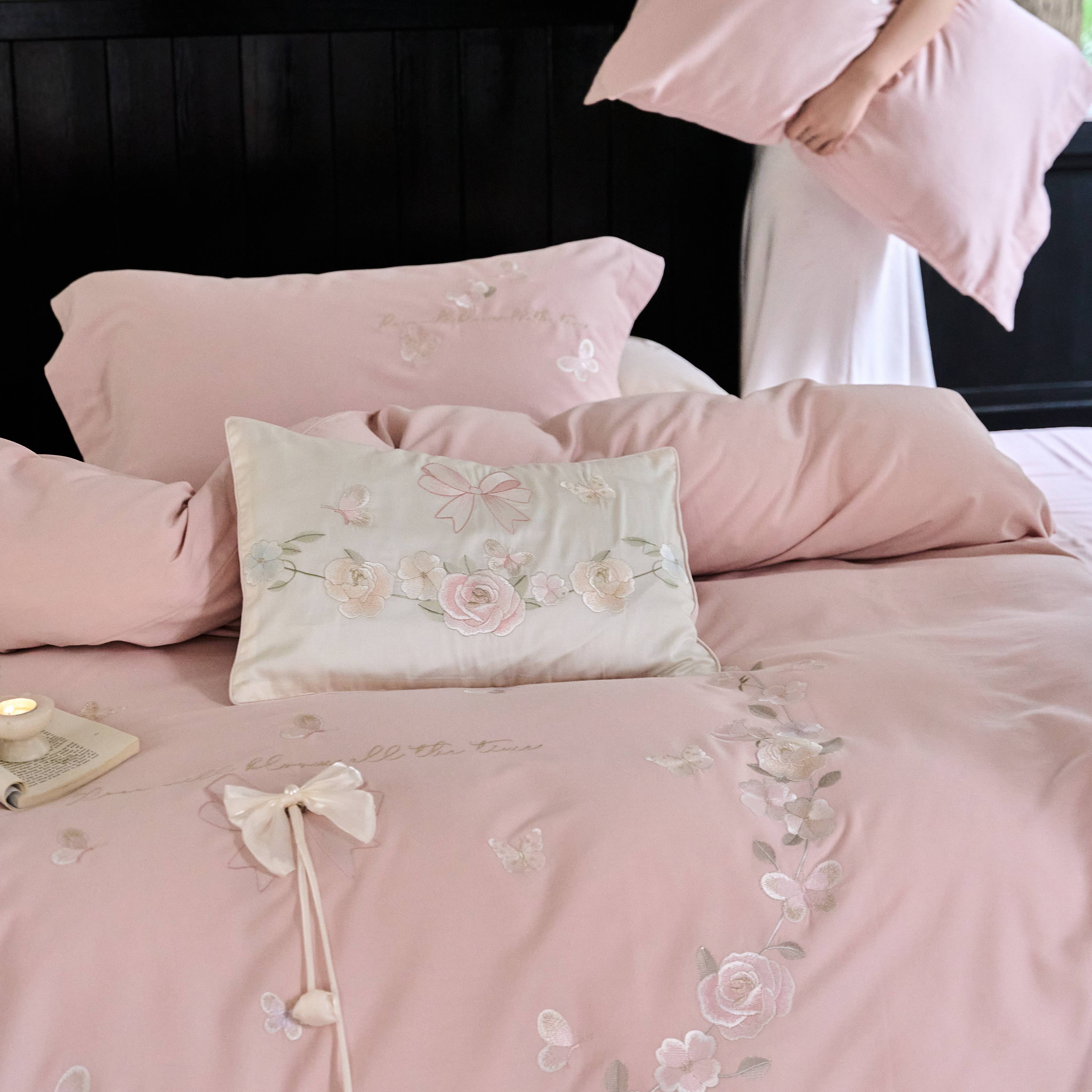 (总)佳汐蓝家纺 2025春夏新款天丝棉蝶舞繁花绣花天丝四件套,蝶舞繁花·粉,蝶舞繁花·蓝