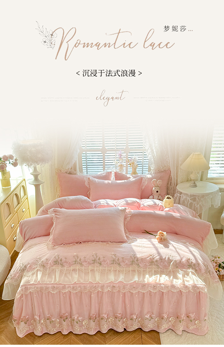 商品名称:苏米娜2025秋冬新款230g双层绣花花边全消光牛奶绒床裙款四件套纯色蕾丝花边刺绣床裙款三件套 依恋-樱花粉