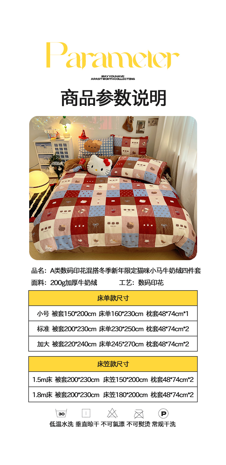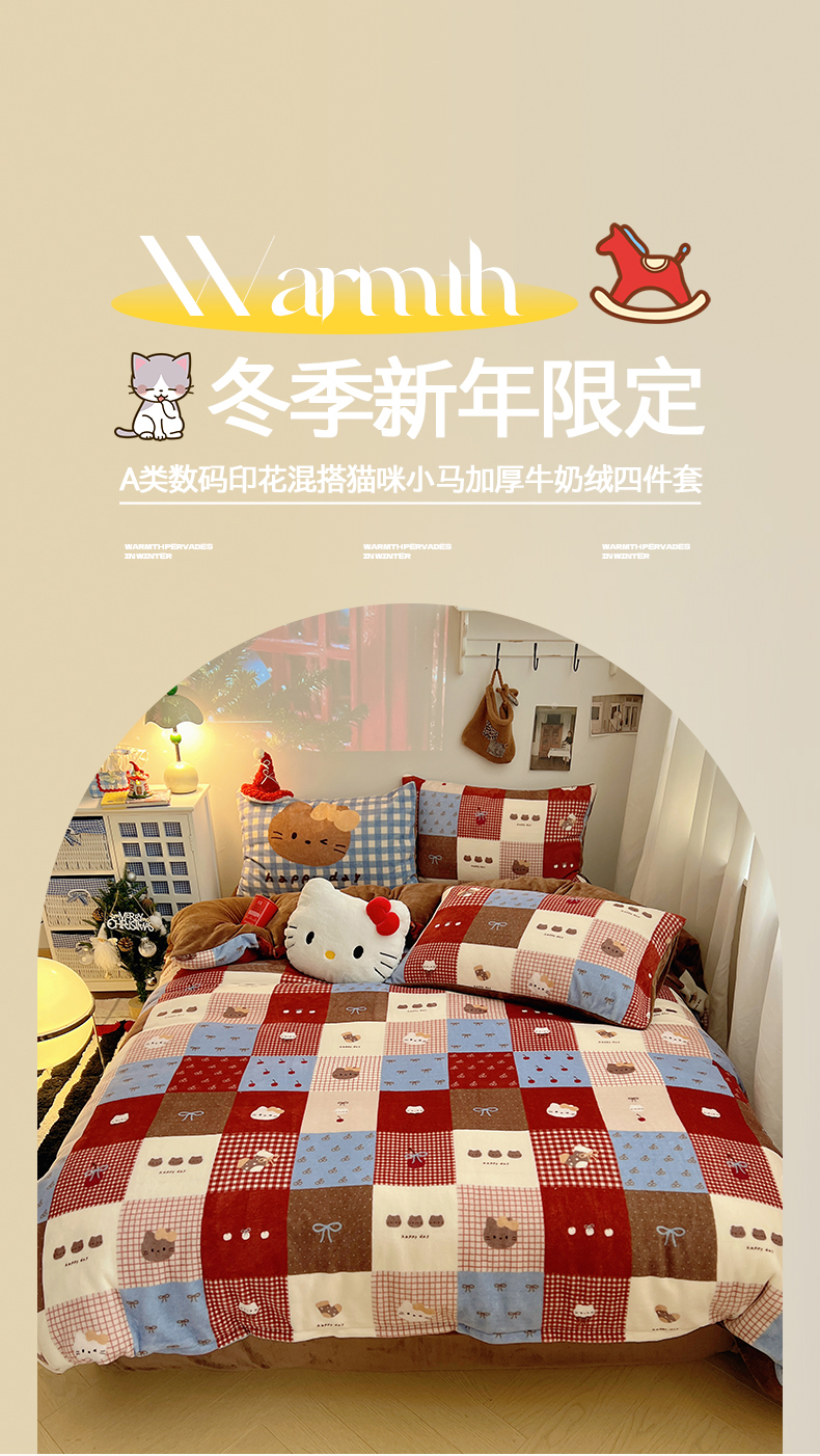桃子家居 2026新款A类数码印花混搭冬季新年限定猫咪小马加厚牛奶绒四件套 绒-樱桃猫猫红