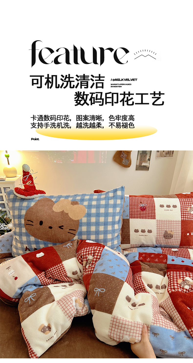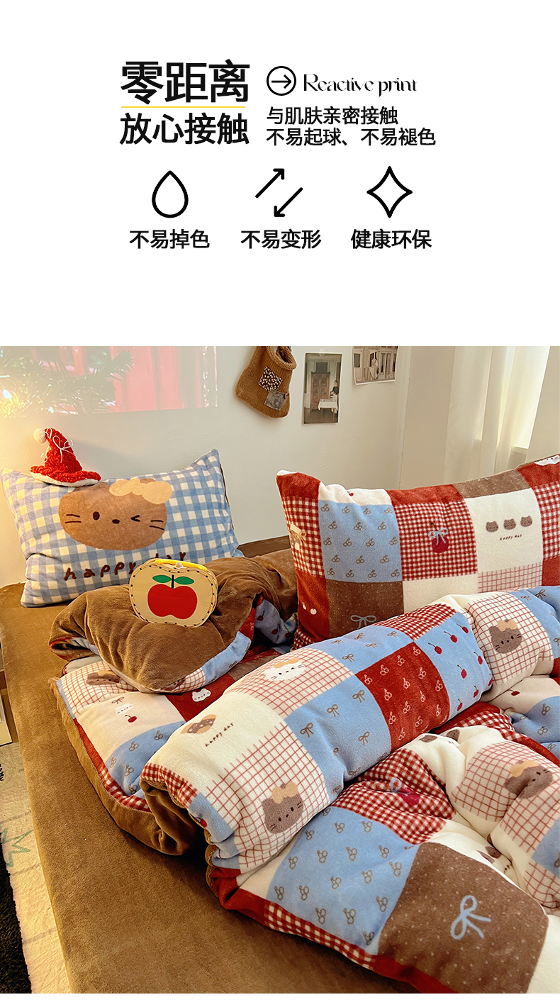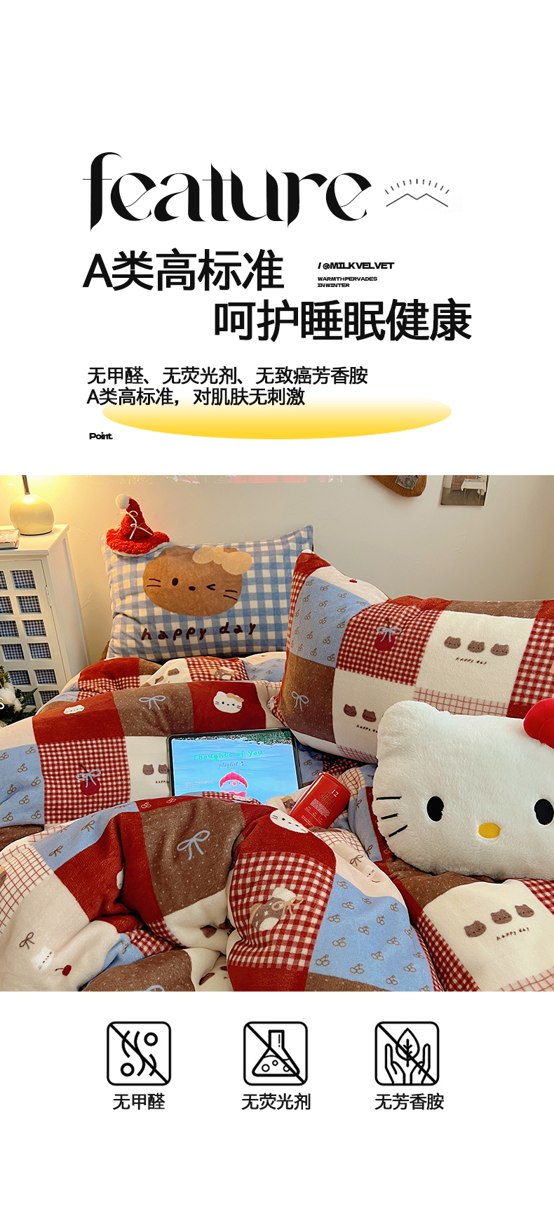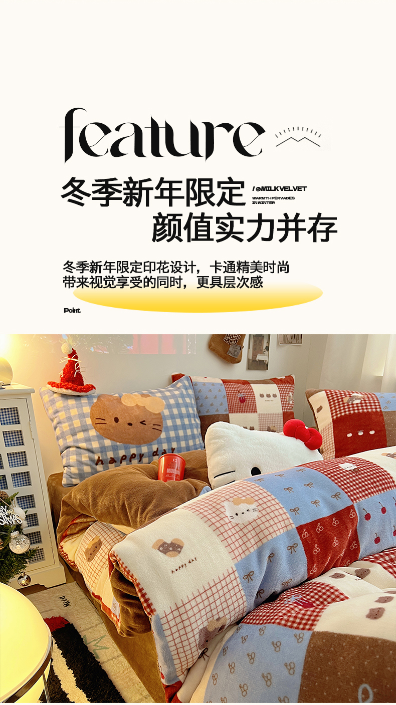 商品名称:桃子家居 2026新款A类数码印花混搭冬季新年限定猫咪小马加厚牛奶绒四件套 绒-樱桃猫猫红