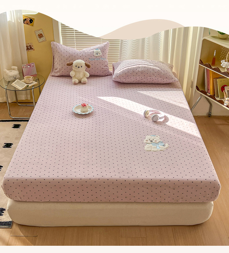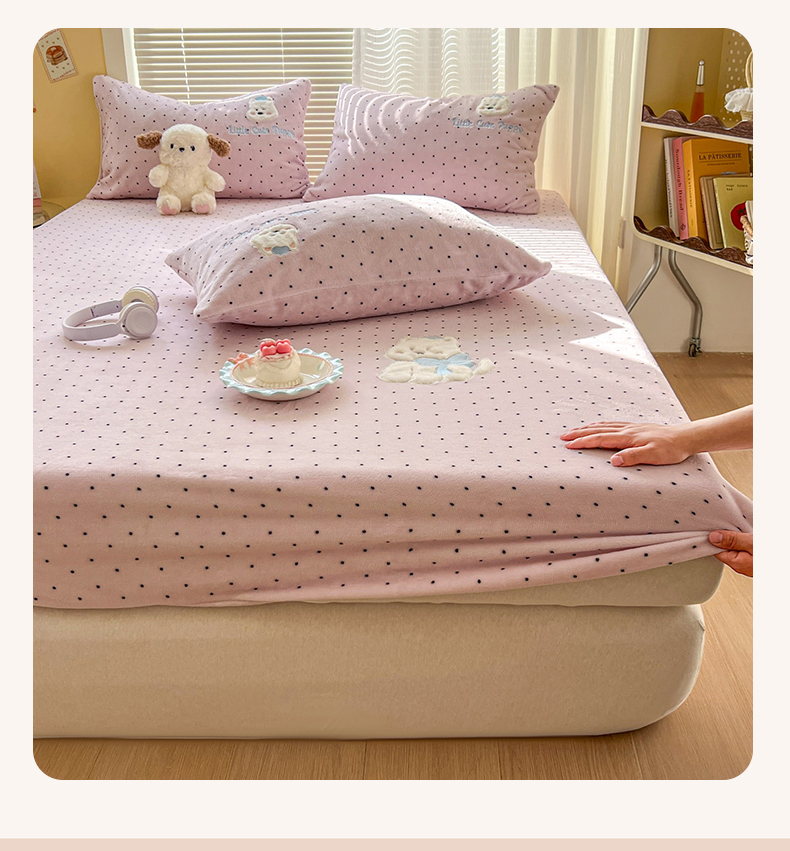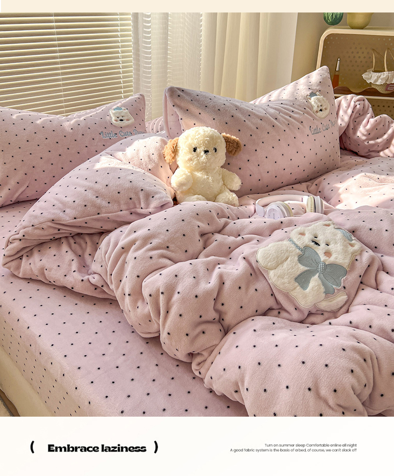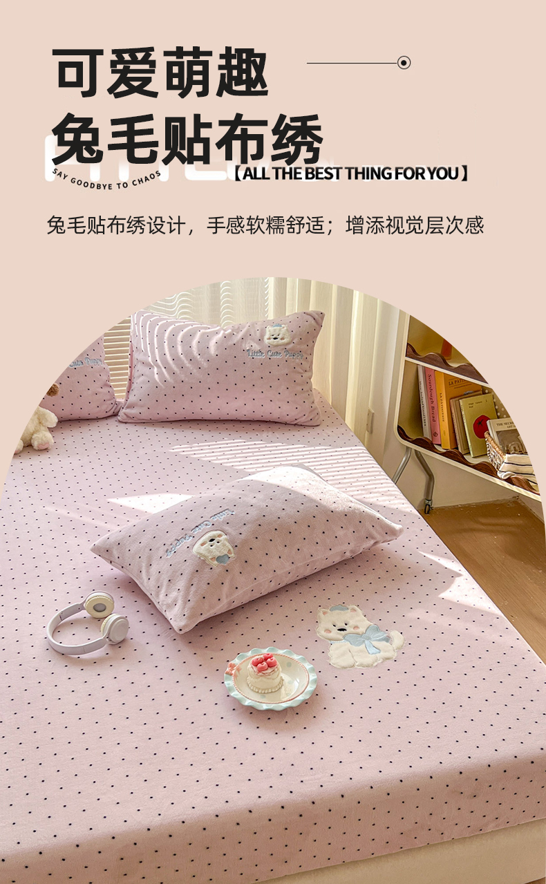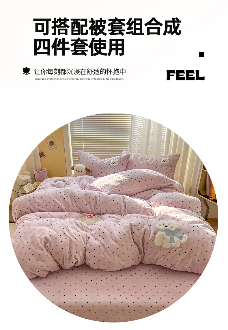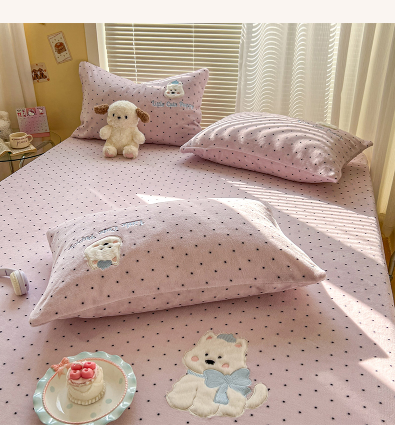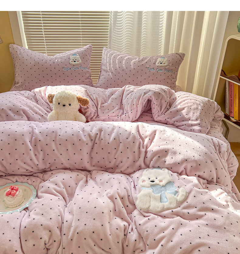 十里居 2026新款韩系牛奶绒兔毛贴布绣床笠三件套四件套 波点小狗粉