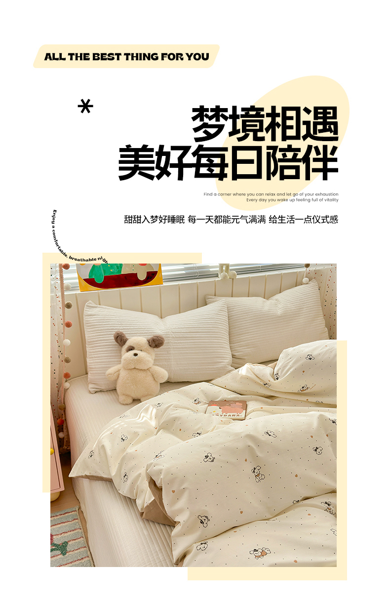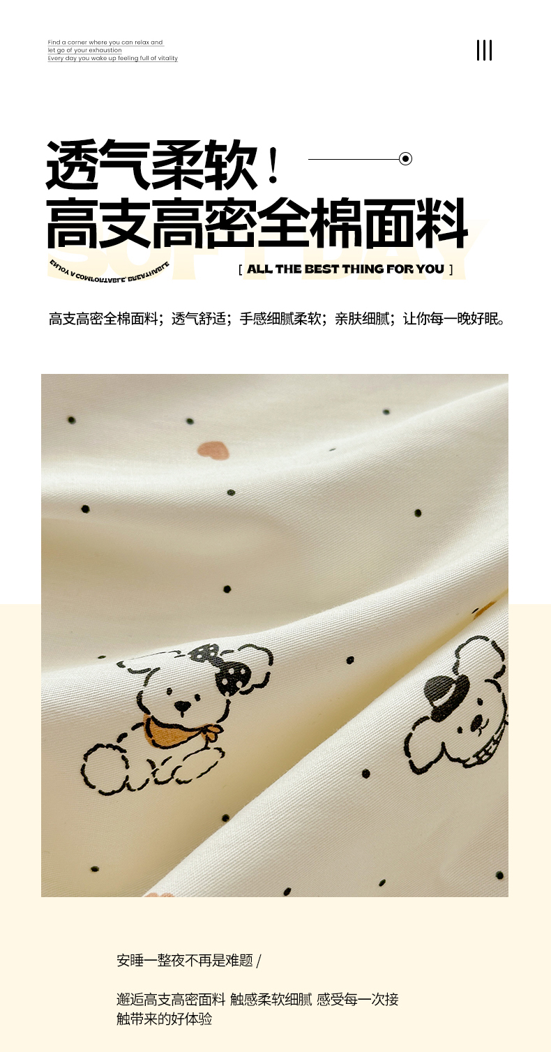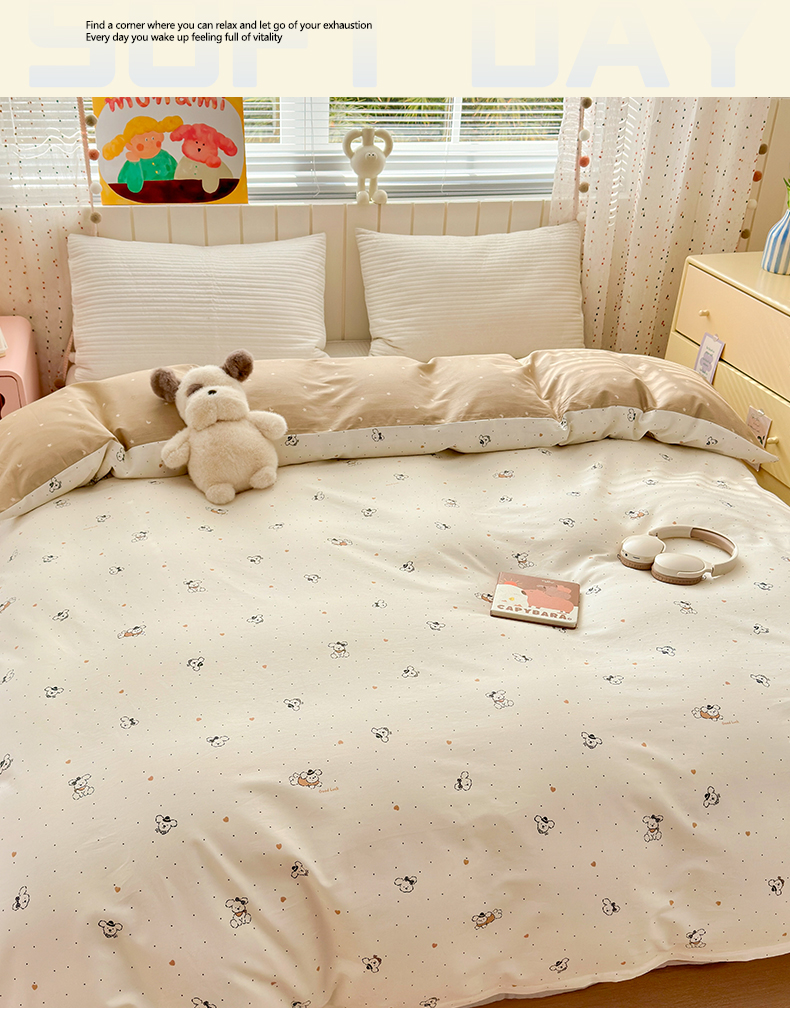 • 91家纺网 家纺一手货源 找家纺 梵克保罗 2026春夏新款ins小清新40支全棉13372四件套学生三件套单被套单枕套系列-第一批(单被套) 点点小狗