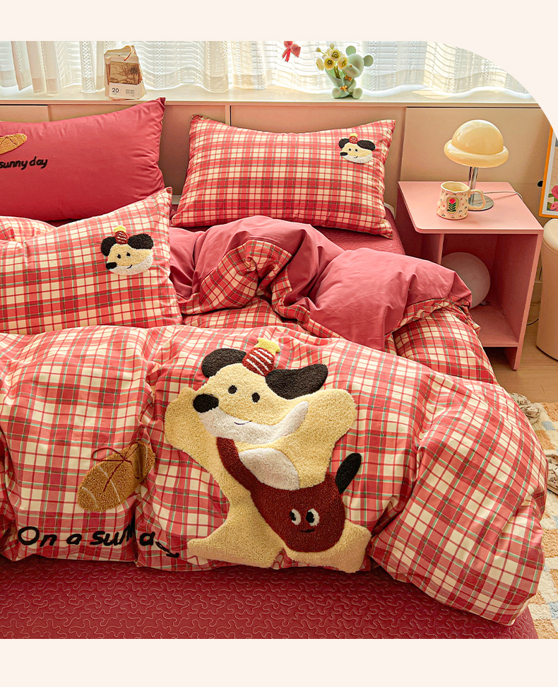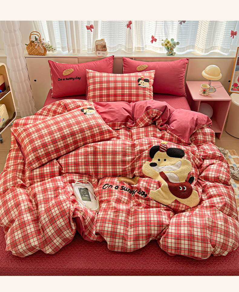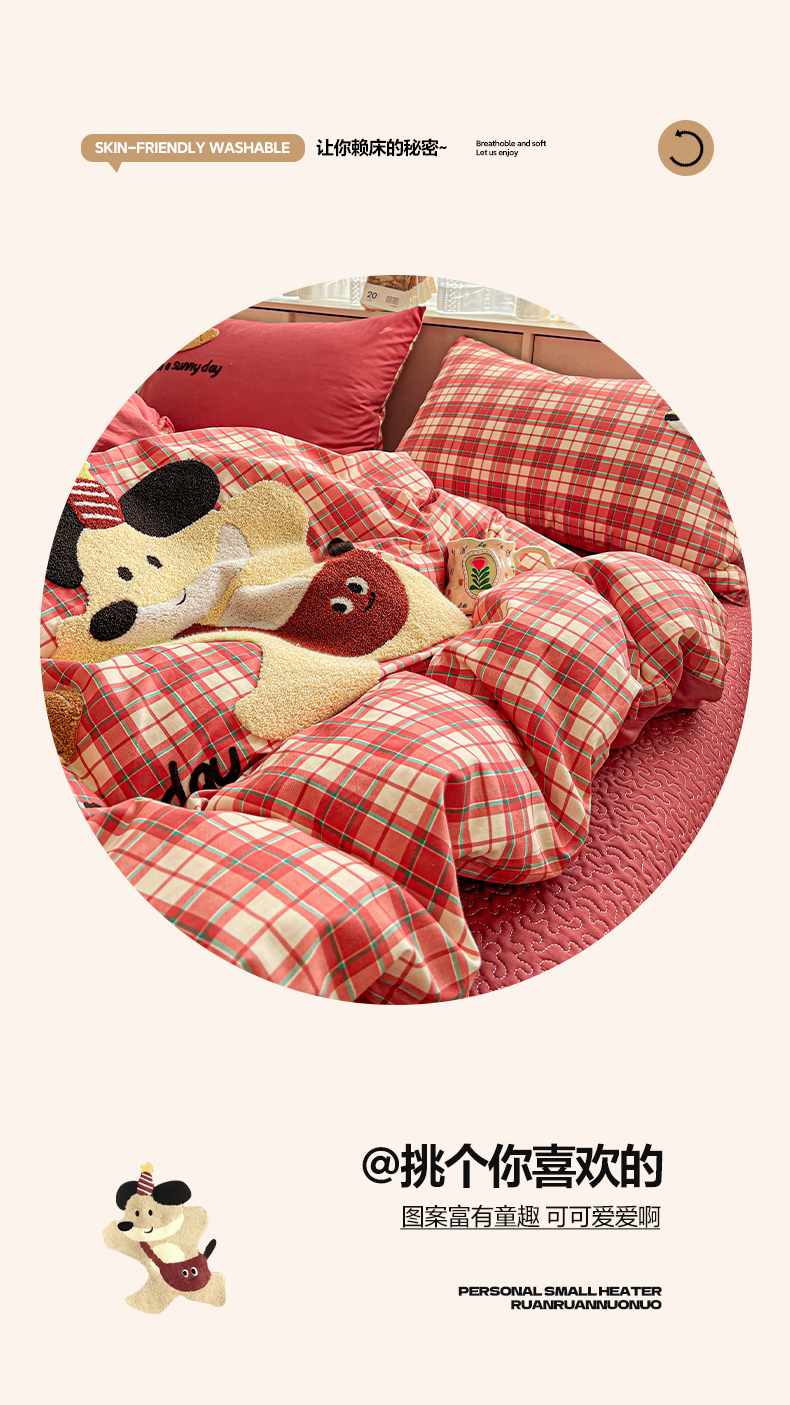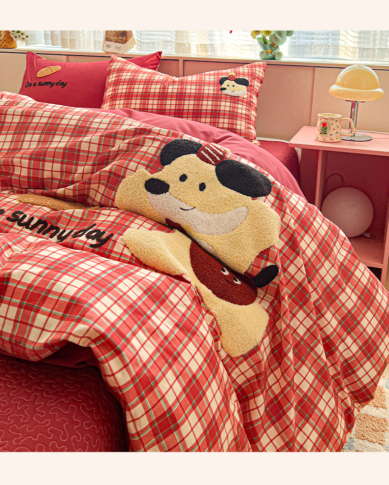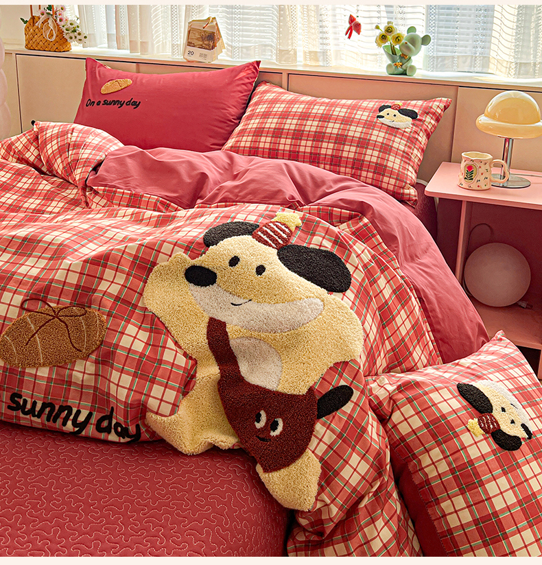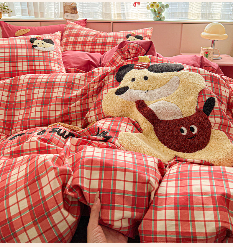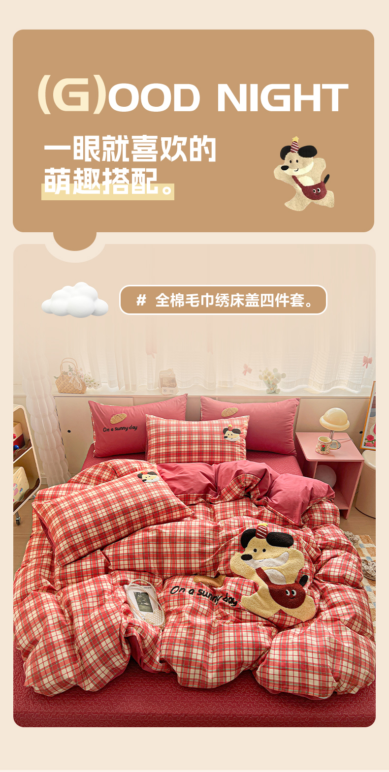 鑫喜莱家纺 2026新款全棉纯棉13372床盖款原创毛巾绣四件套 面包小狗